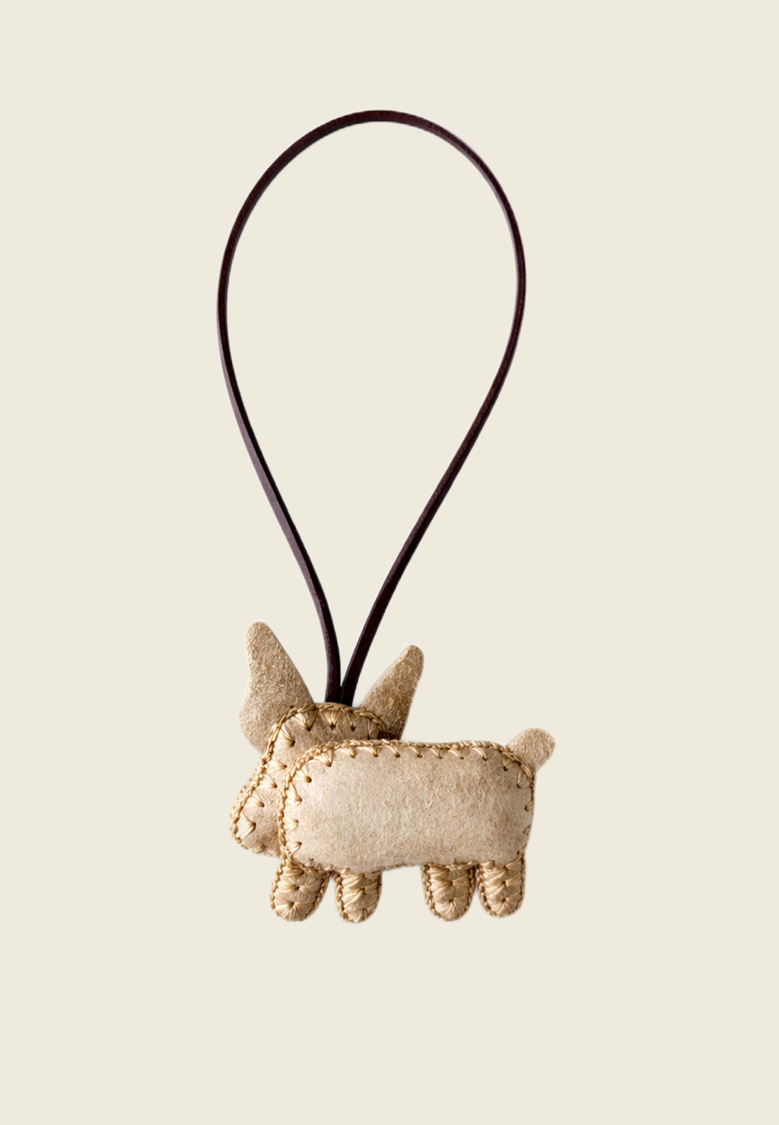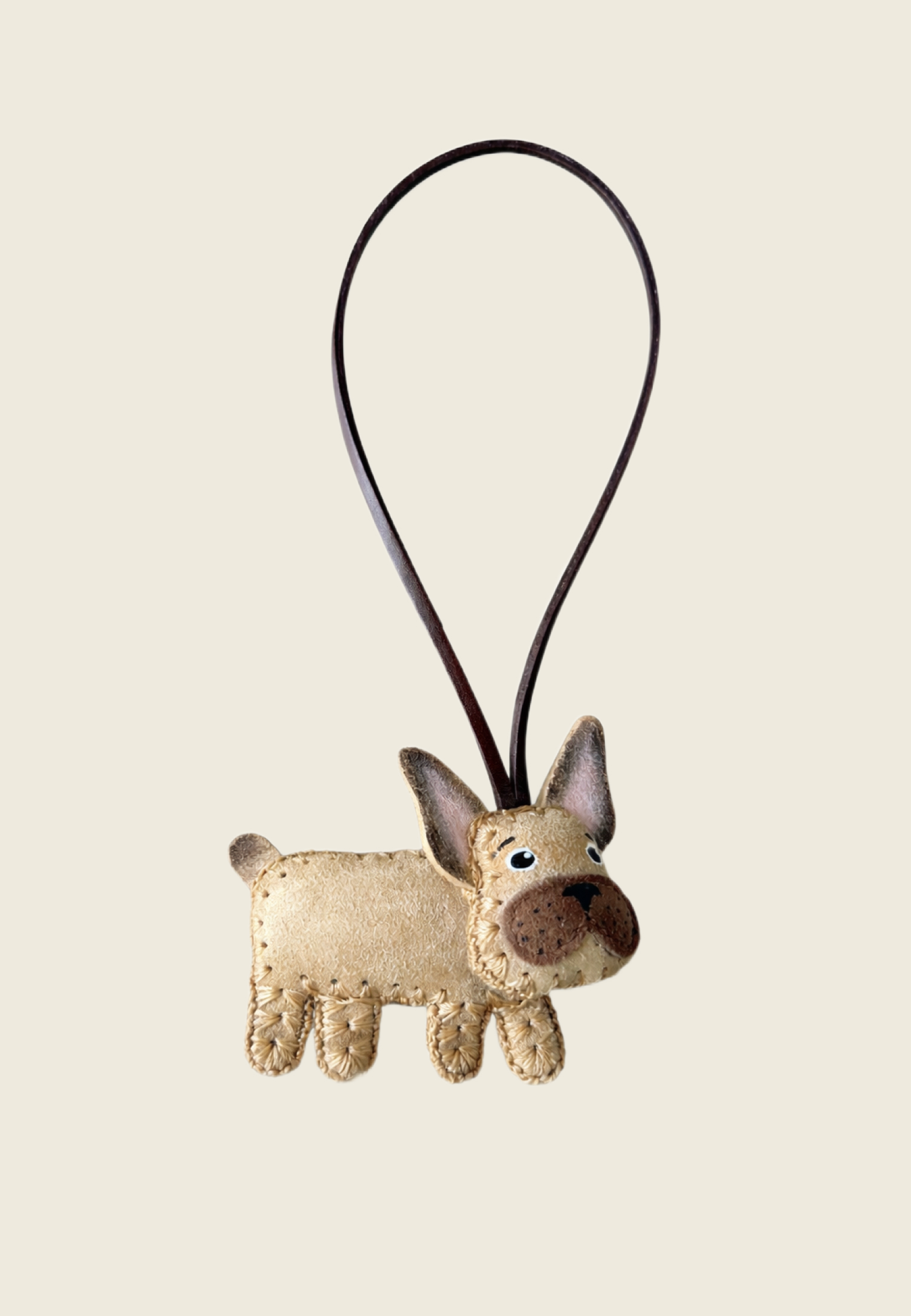 Подвес выполнен из натуральной замши и аккуратно прошит по контуру — каждая строчка добавляет ему живости и характера. Подвес удобно крепится к сумке, рюкзаку или ключам, превращая привычные вещи в что-то более личное.