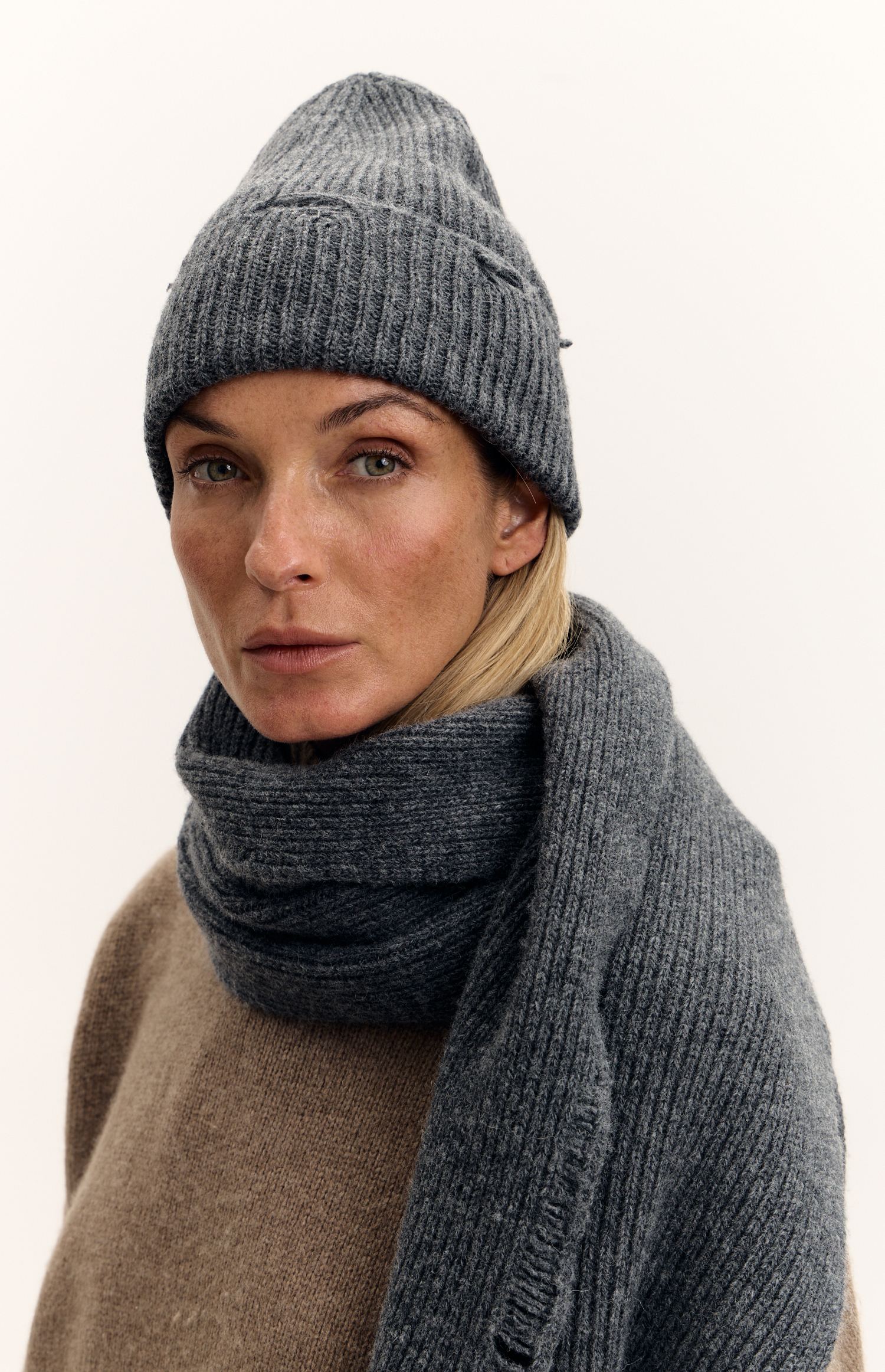 Модель выполнена из шерсти, имеет плотную вязку. Комплект состоит из шапки и шарфа. Особенностью данной модели являются искусственно созданный эффект состаренного изделия (дырки).