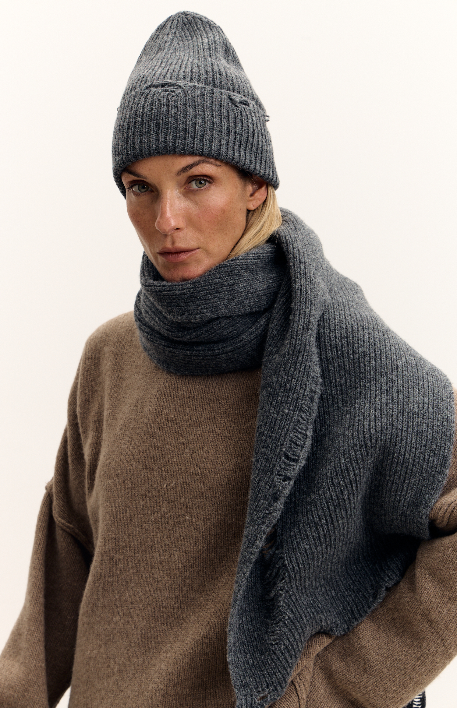 Шапка тонкая, но очень теплая, хороший состав. В эксплуатации месяц, не закатывается. Шарф широкий и длинный, можно красиво намотать. Выглядит модно и дорого.