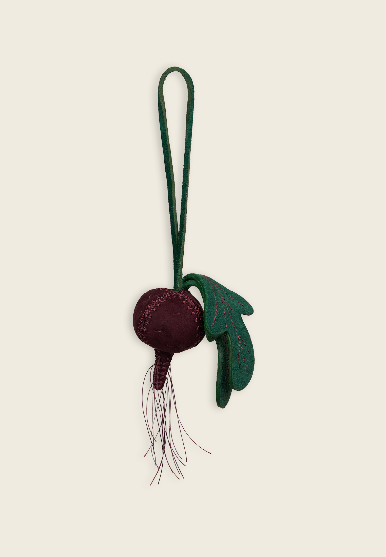 Подвес в форме свёклы выполнен вручную из натуральной замши с аккуратной отделкой. Его мягкая текстура и тёплые оттенки создают приятное тактильное впечатление, а форма свёклы несёт в себе символику здоровья, жизненной силы и плодородия.