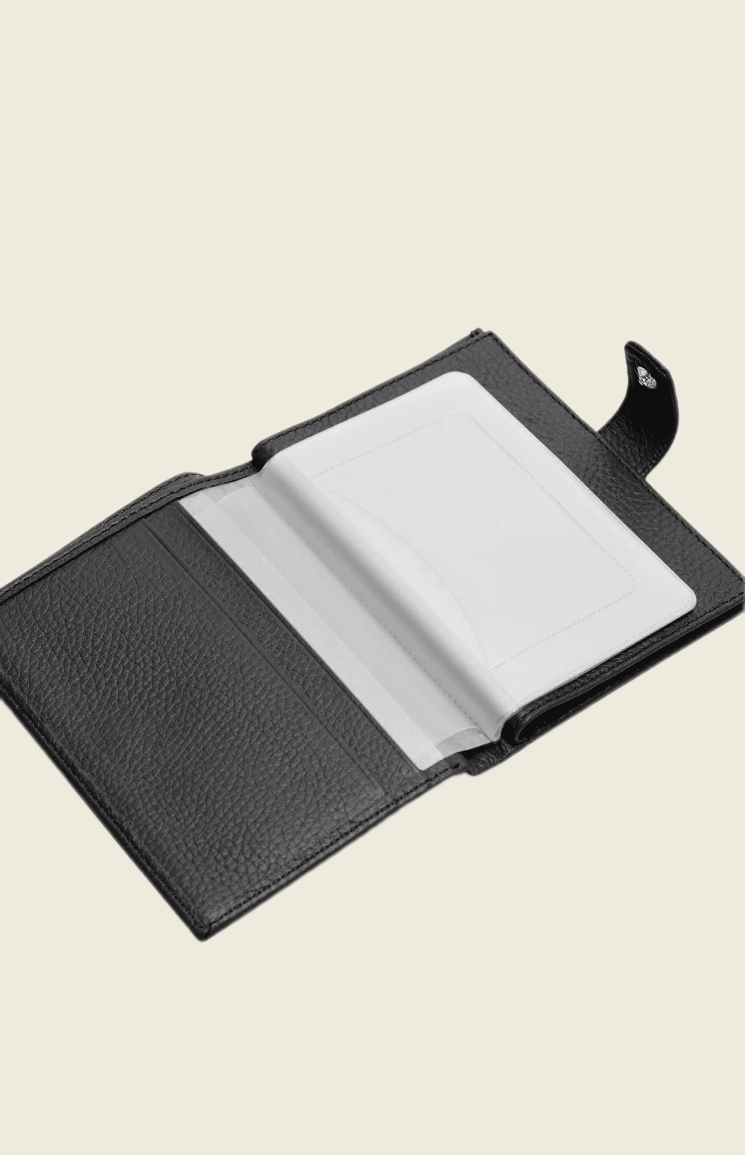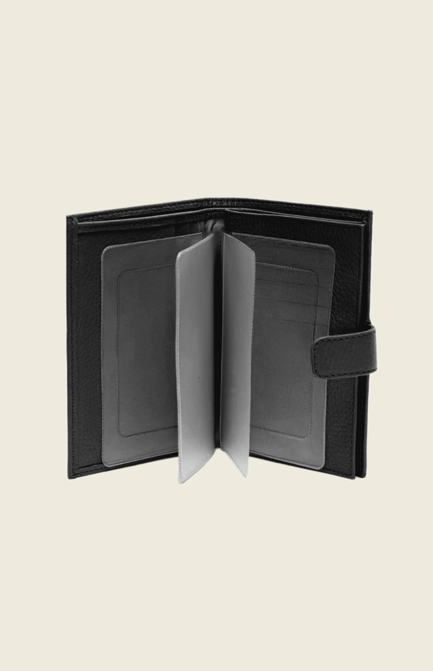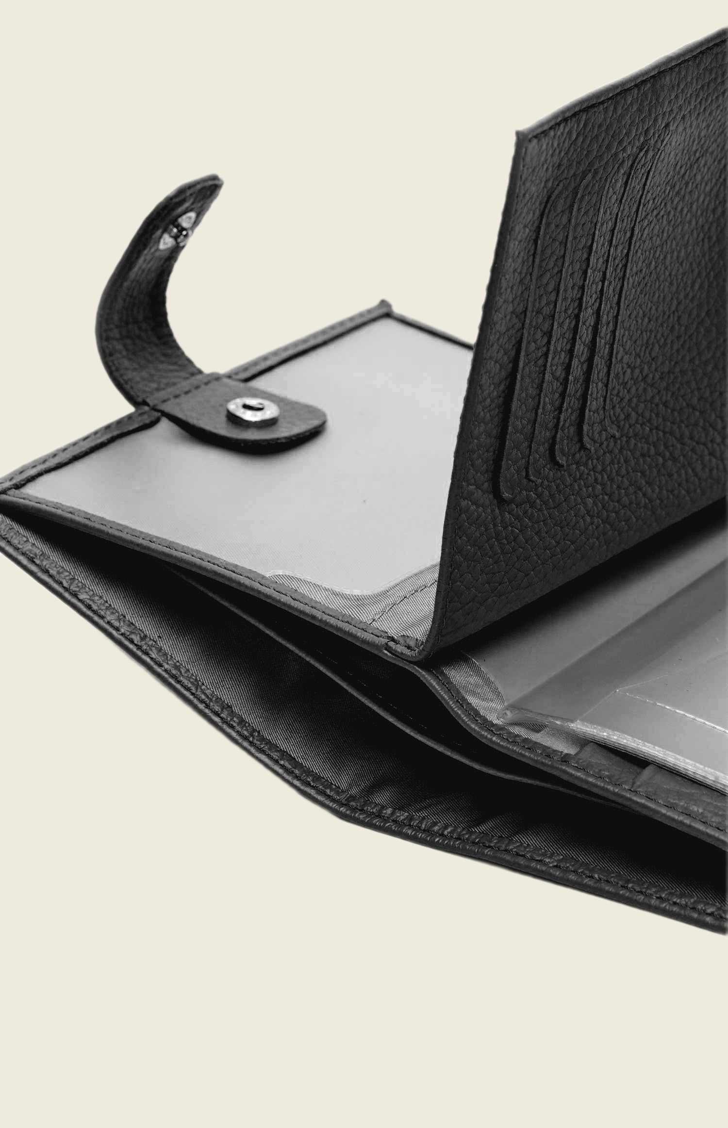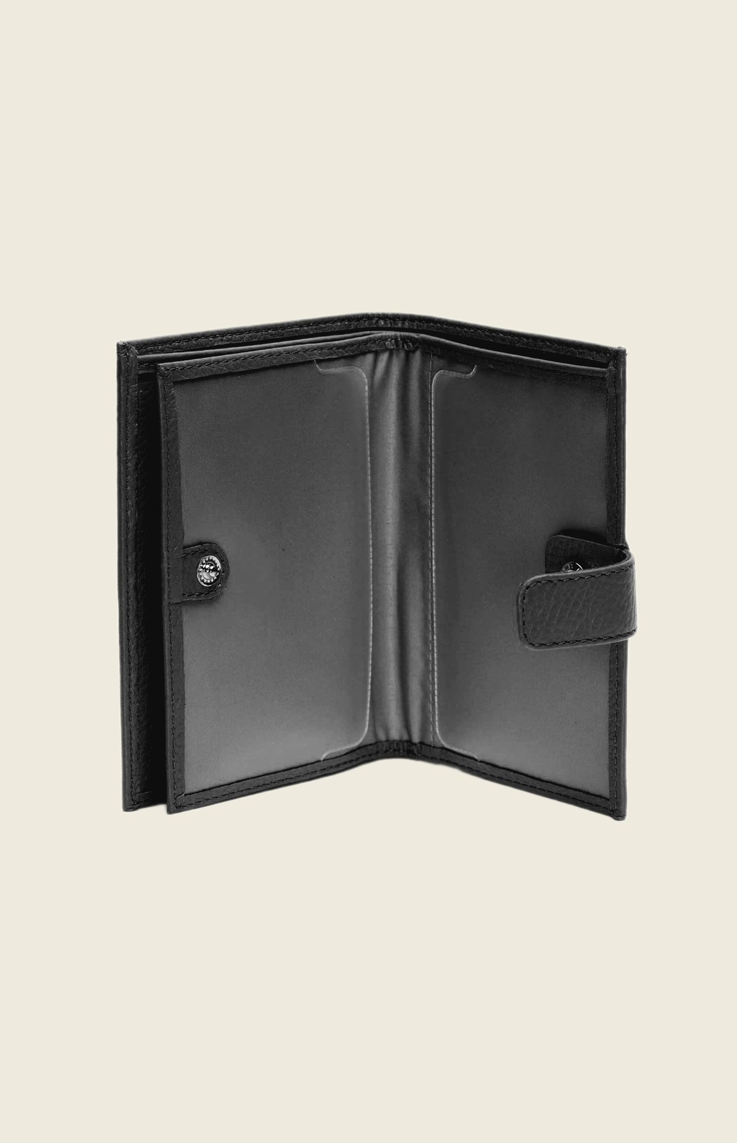 Аксессуар выполнен из зернистой кожи. Закрывается на прочную кнопку. Внутри – несколько отделений: для паспорта, денежных купюр, водительского удостоверения и кредитных карт.