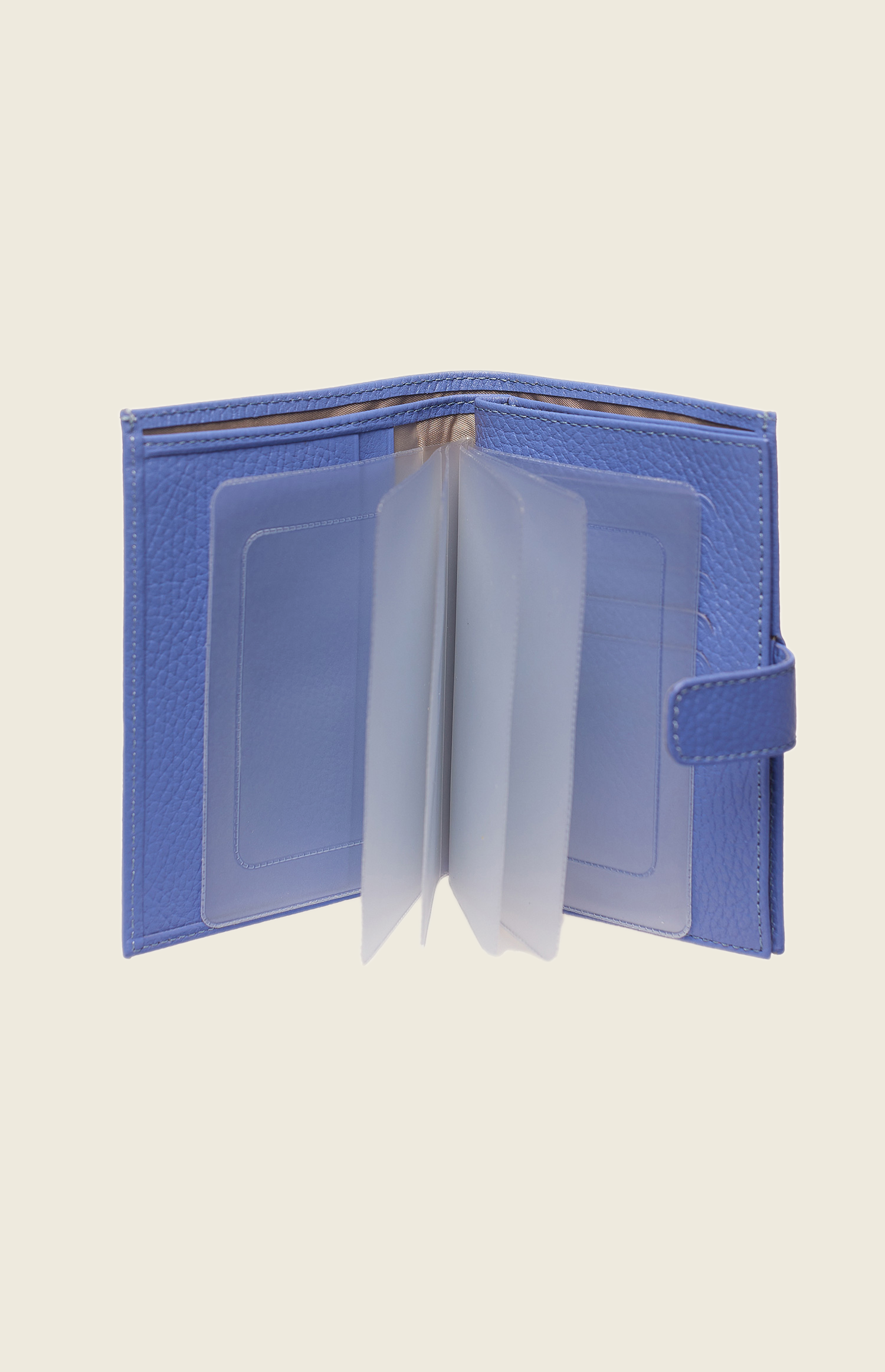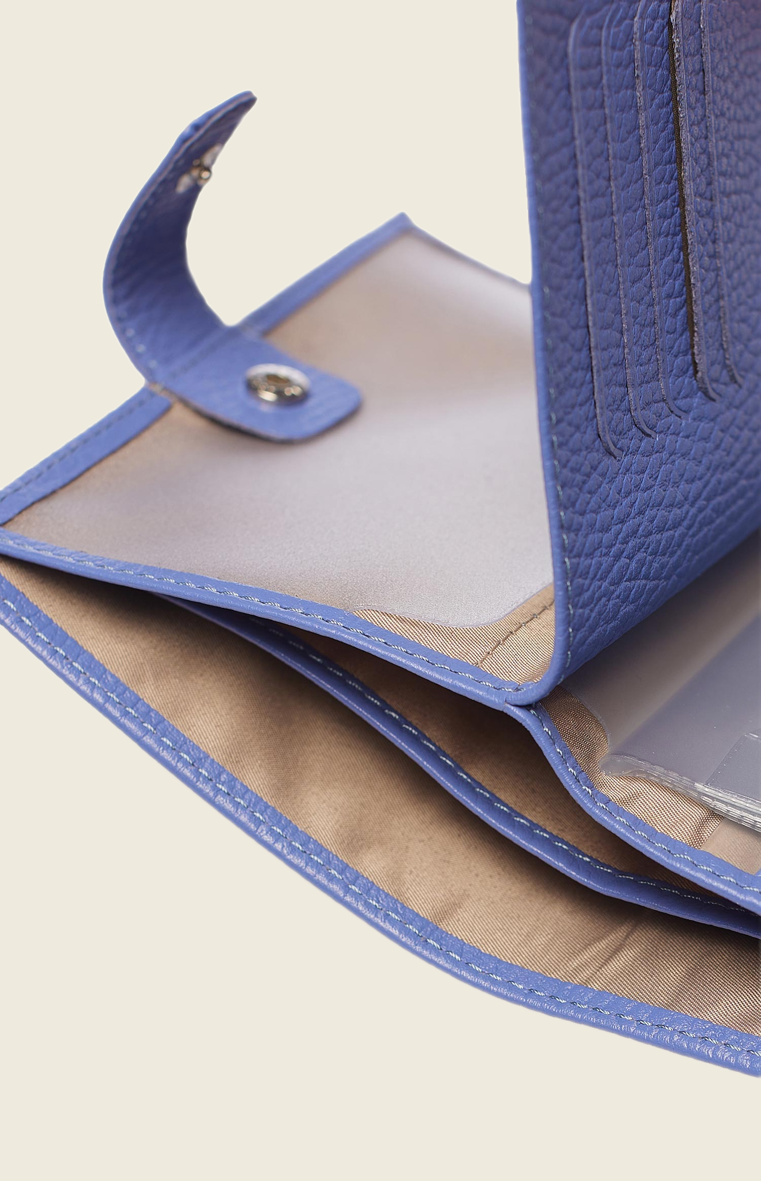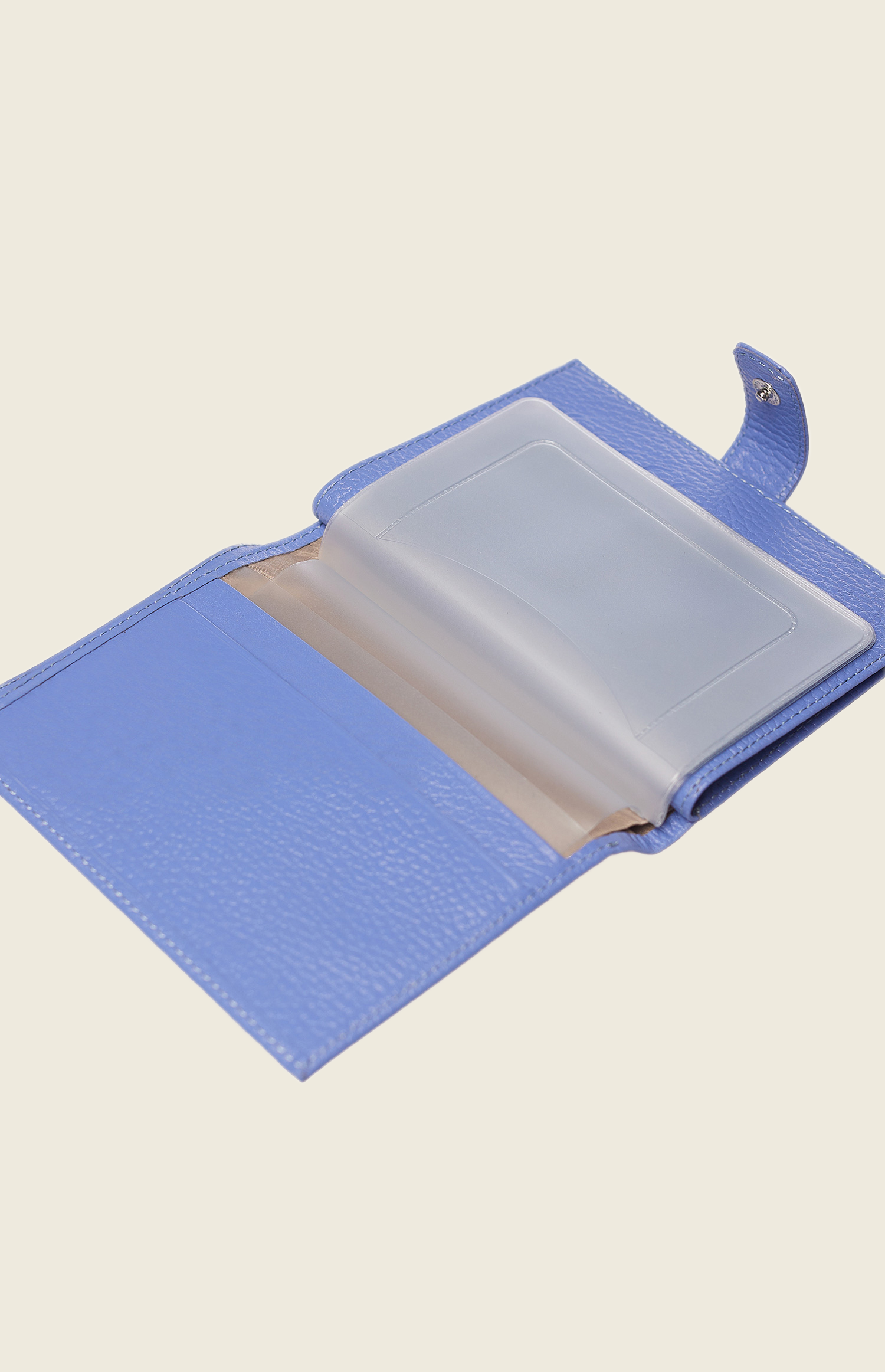 Аксессуар выполнен из зернистой кожи и закрывается на прочную кнопку. Внутри – несколько отделений: для паспорта, денежных купюр, водительского удостоверения и кредитных карт.