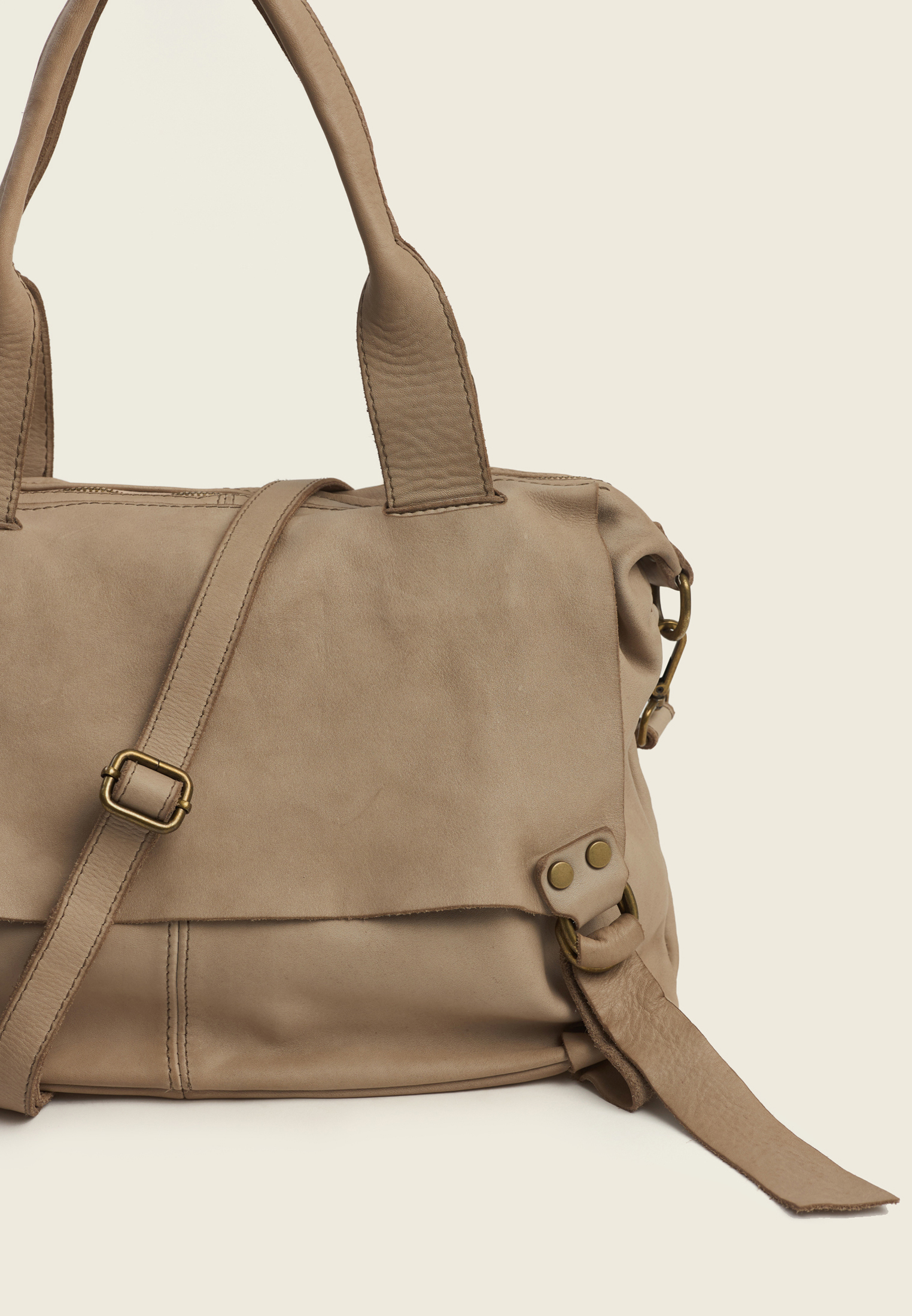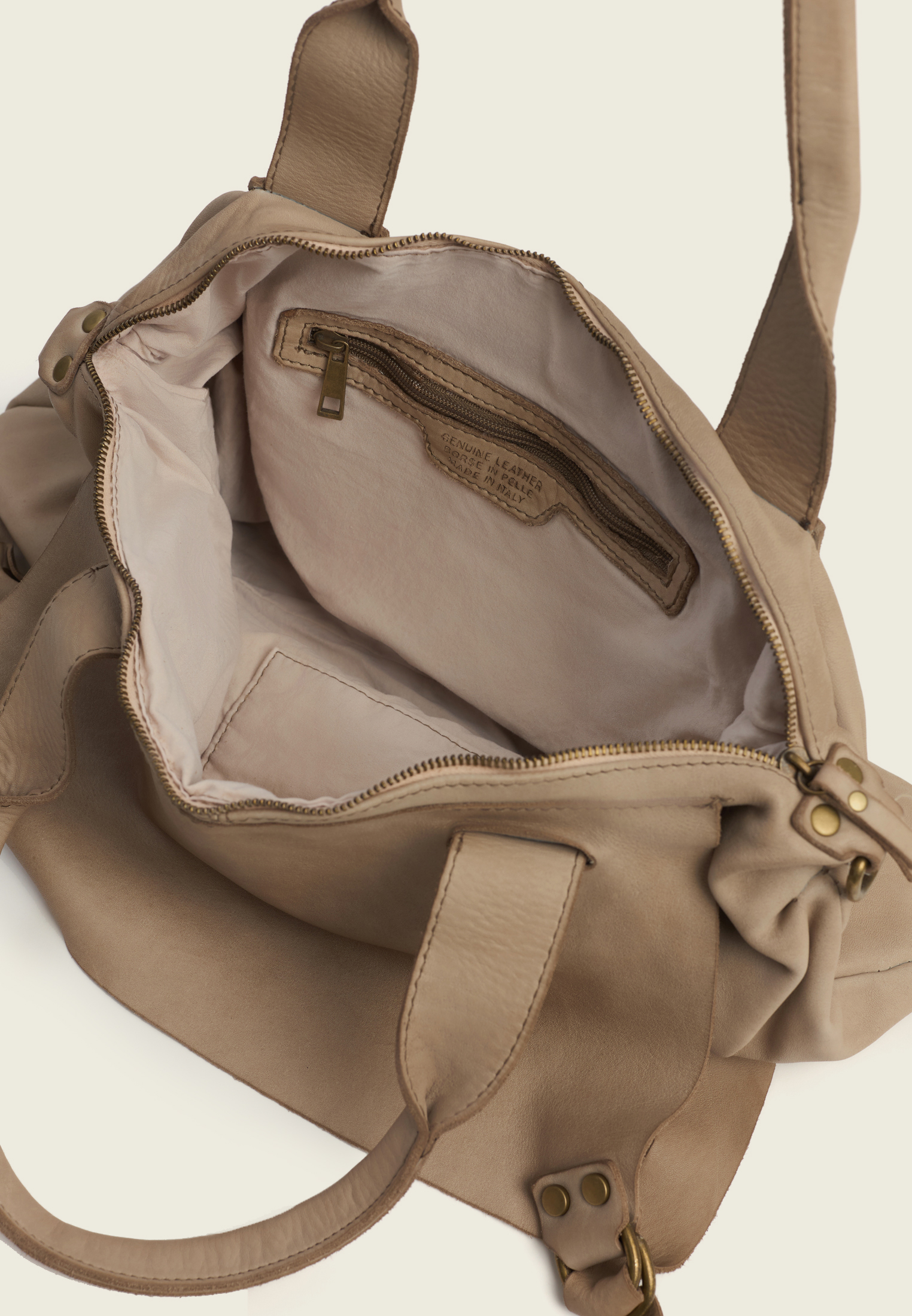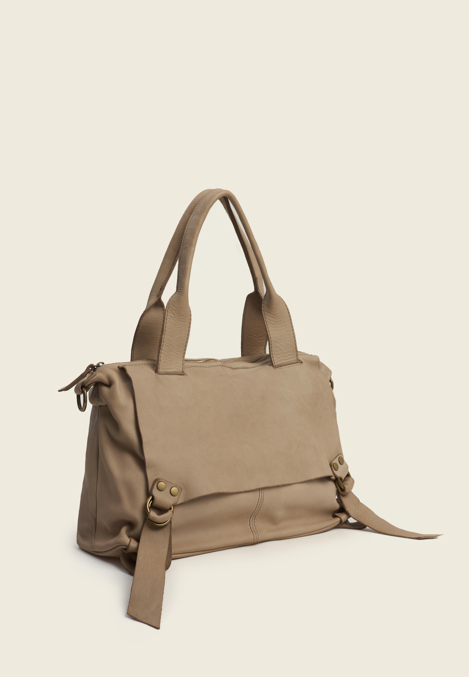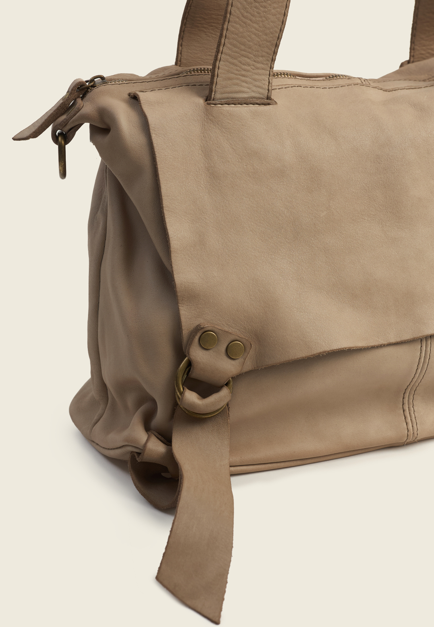 Внутри — основное отделение и два боковых кармана (для секретов). Ремень отстёгивается, так что сумку можно носить в руках, на плече или через плечо — в зависимости от ритма дня.