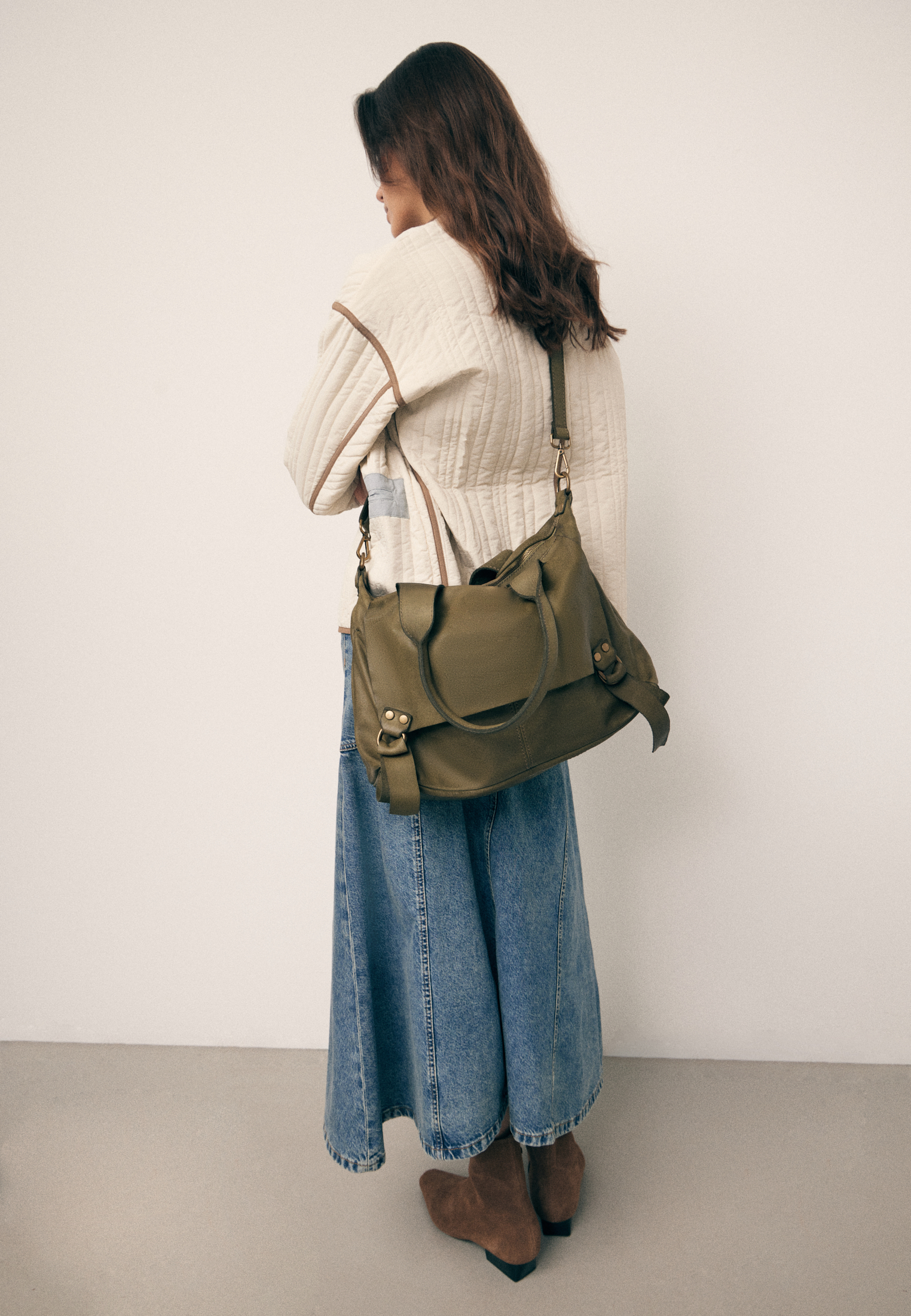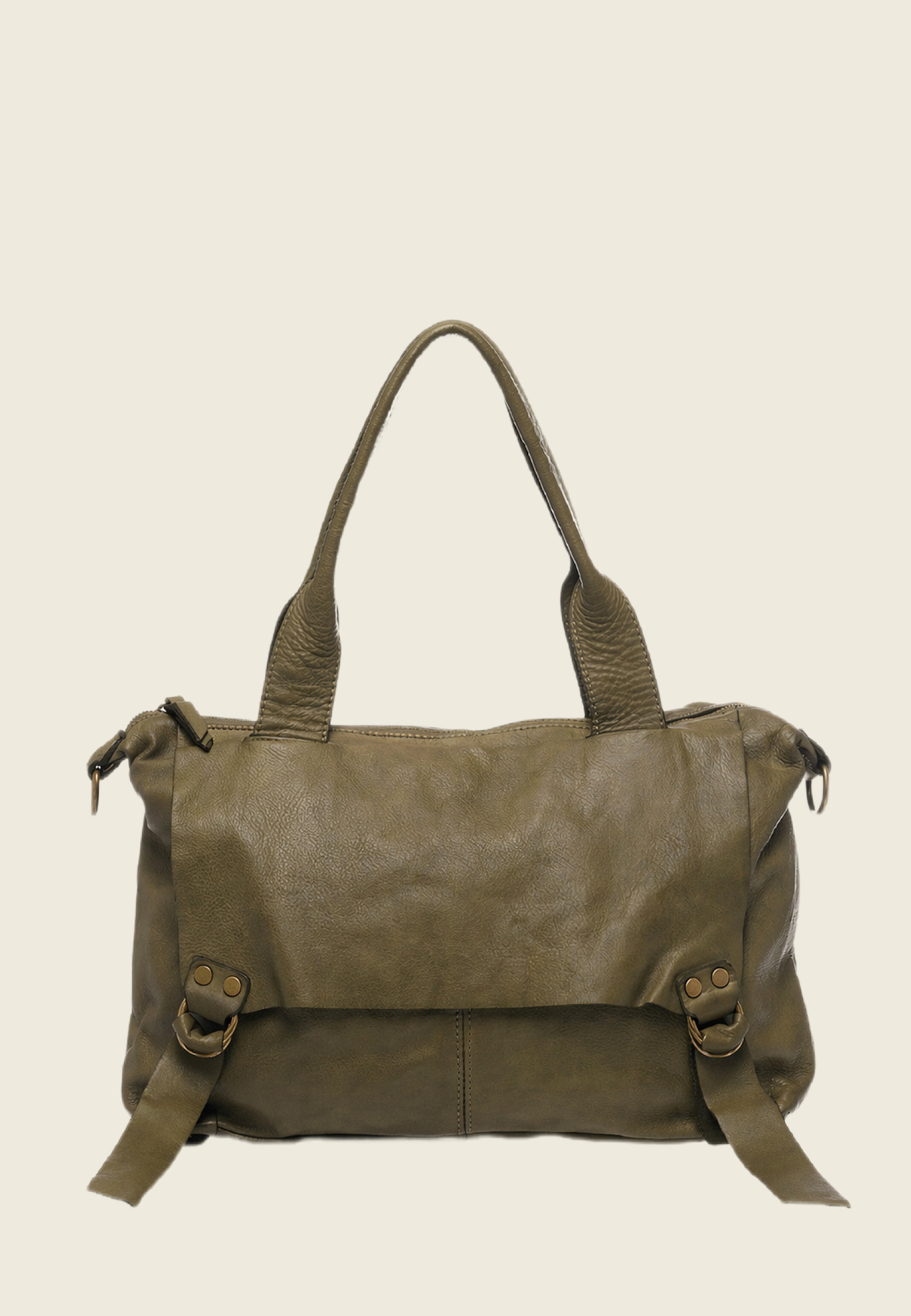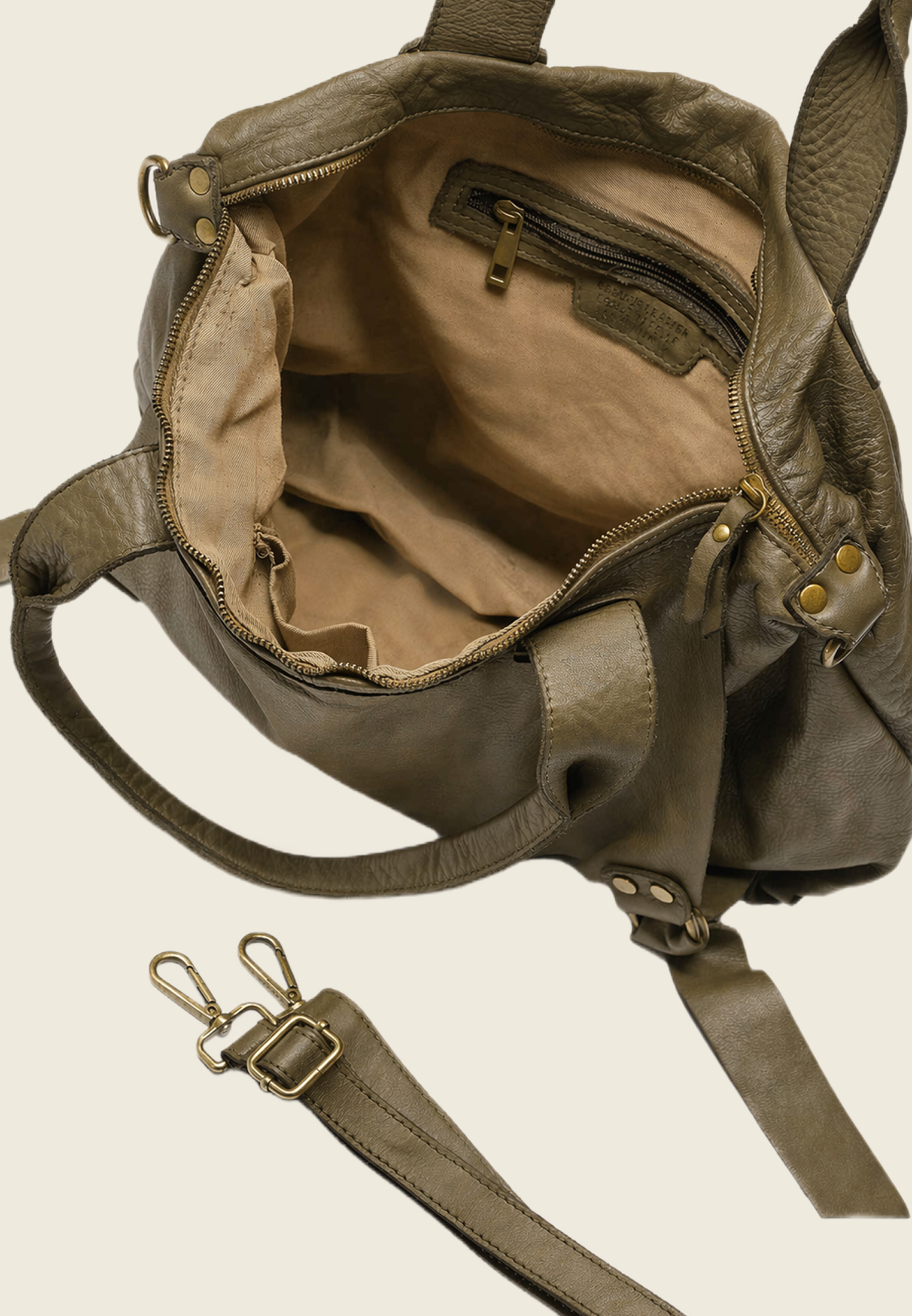 Внутри — основное отделение и два боковых кармана (для секретов). Ремень отстёгивается, так что сумку можно носить в руках, на плече или через плечо — в зависимости от ритма дня.
