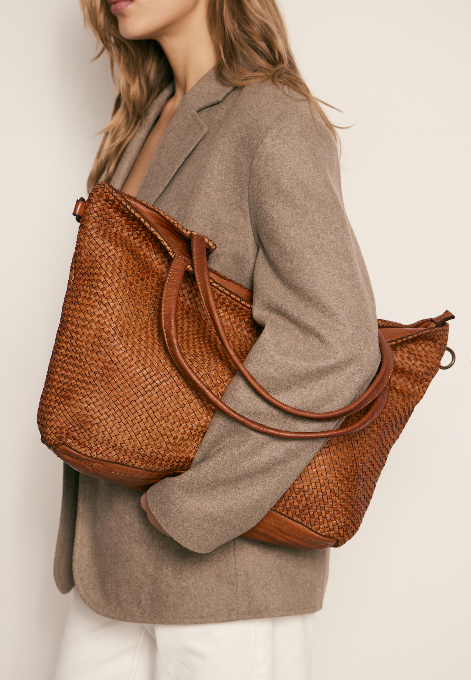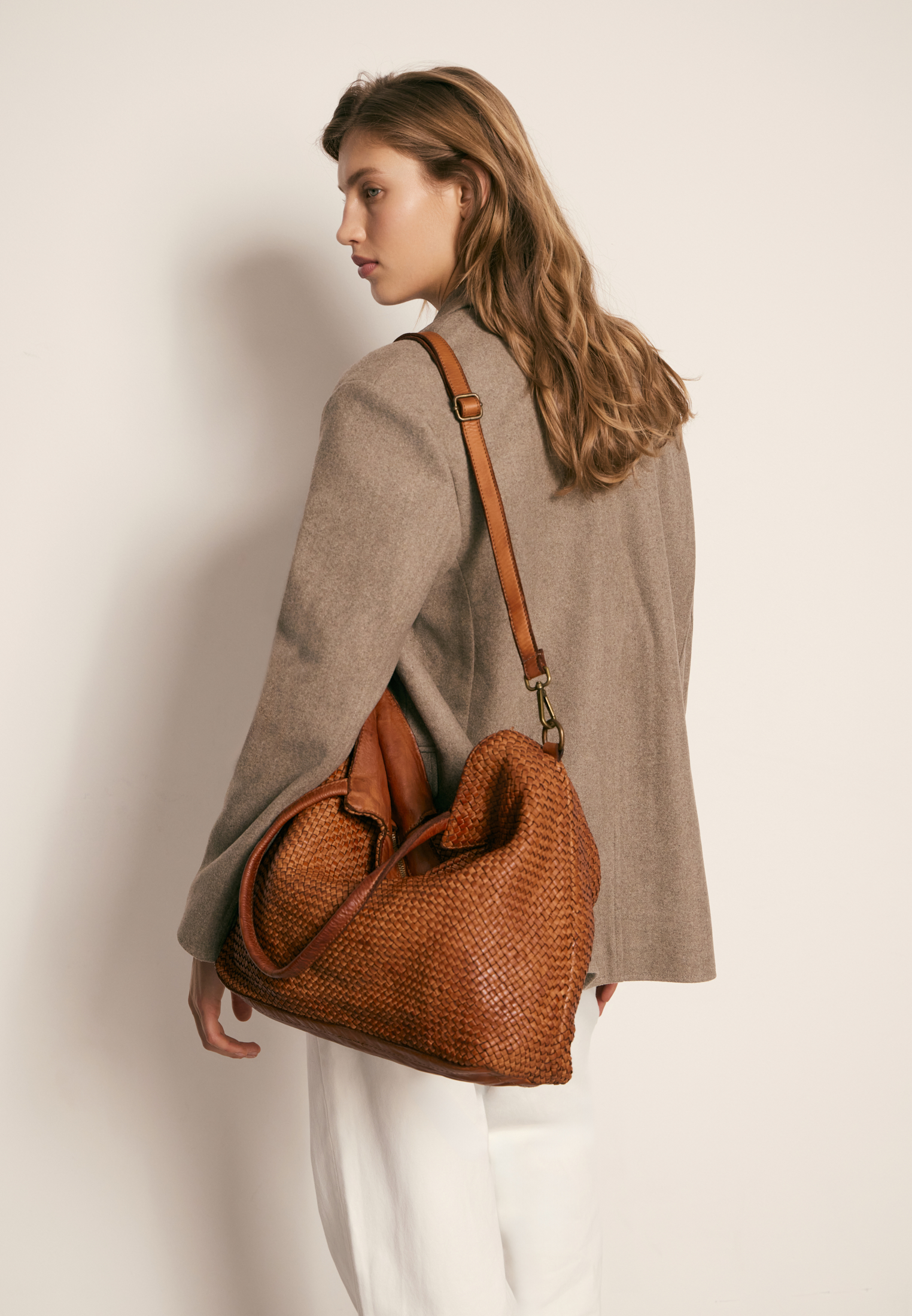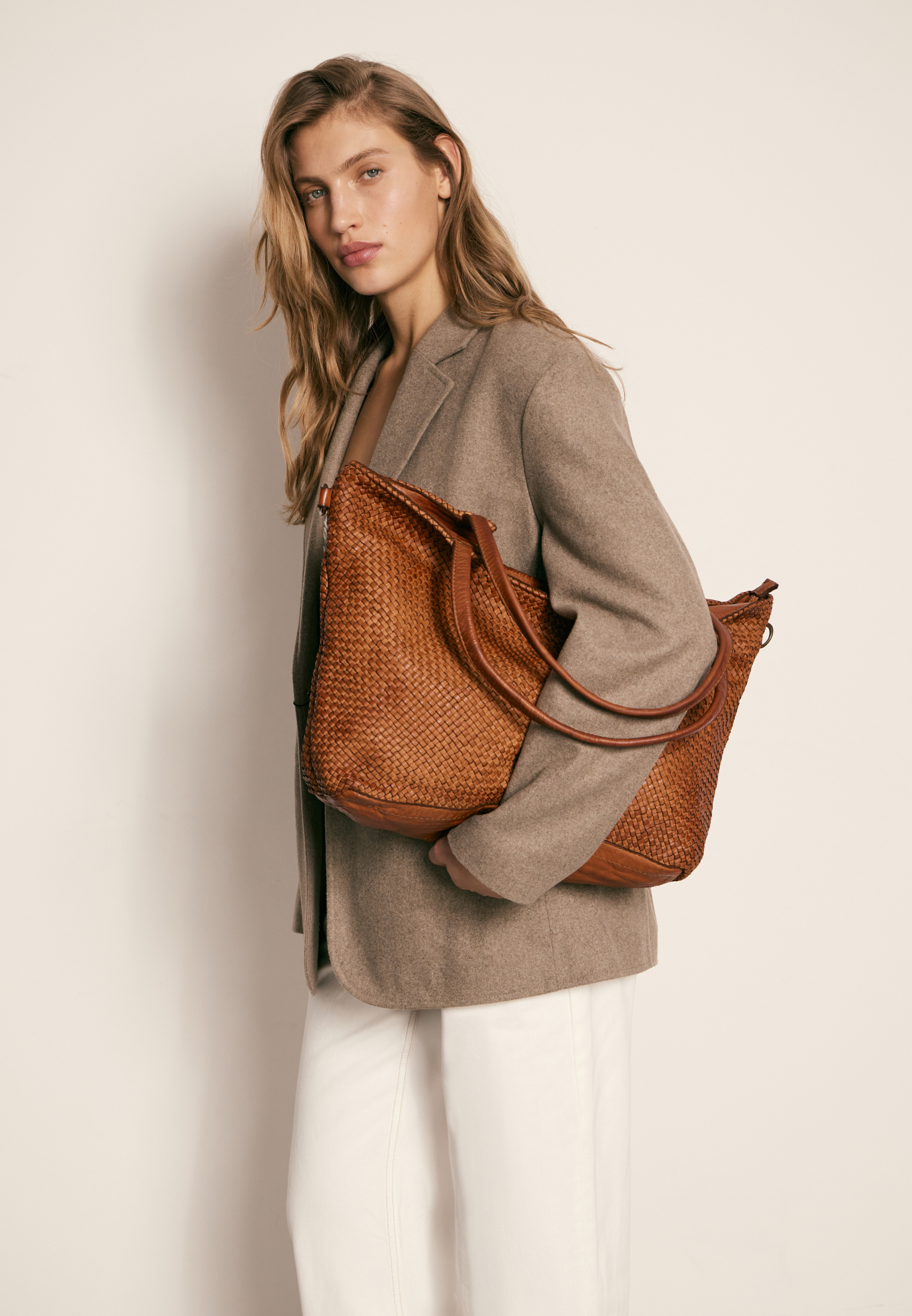 Сумка из натуральной необработанной кожи с аккуратным плетением. Мягкая, но структурная — благодаря форме и плотному материалу. Выразительная текстура делает её заметной деталью образа.