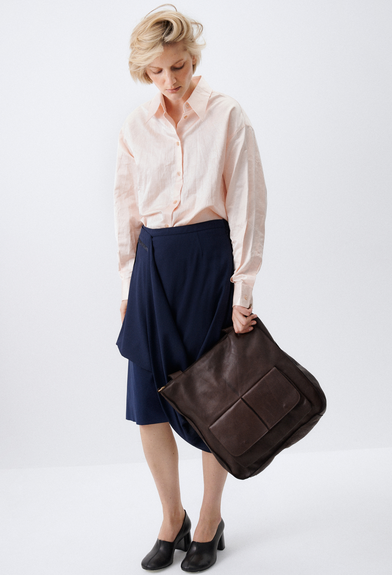Внутри — просторное отделение и два кармана: один на молнии для документов и ценностей, второй — открытый для мелочей. Снаружи — два дополнительных кармана: спереди на магнитных кнопках, сзади на молнии. Удобные мягкие ручки позволяют носить сумку в руке или на плече. В комплект входит съёмный регулируемый ремень, если захочется освободить руки. Модель вмещает ноутбук 16 дюймов.