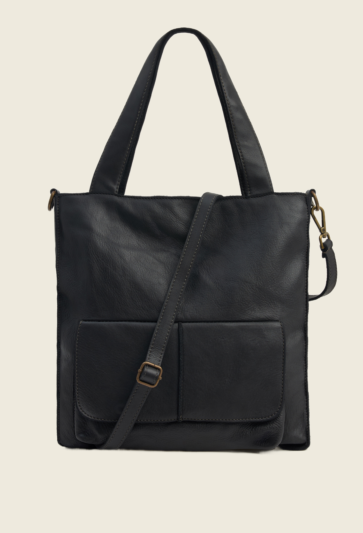 Внутри — просторное отделение и два кармана: один на молнии для документов и ценностей, второй — открытый для мелочей. Снаружи — два дополнительных кармана: спереди на магнитных кнопках, сзади на молнии. Удобные мягкие ручки позволяют носить сумку в руке или на плече. В комплект входит съёмный регулируемый ремень, если захочется освободить руки. Модель вмещает ноутбук 16 дюймов.