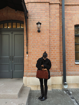 Сдержанная, но выразительная за счёт фактуры — эта сумка сделана из натуральной замши: бархатистой, тёплой, пластичной. Такой материал хочется ощущать под рукой — он мягко подстраивается под образ и особенно приятен на ощупь.