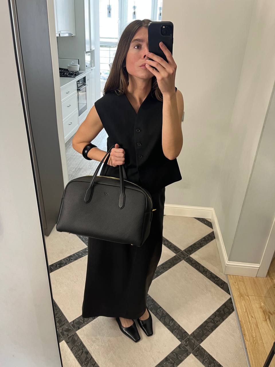 Каркасная сумка-тоут с плавной линией верха и чуть более строгой формой. Она сделана из натуральной зернистой кожи, которая создаёт визуальный ритм и дополняет любой день: её удобно взять на работу, прогулку по городу или в поездку.