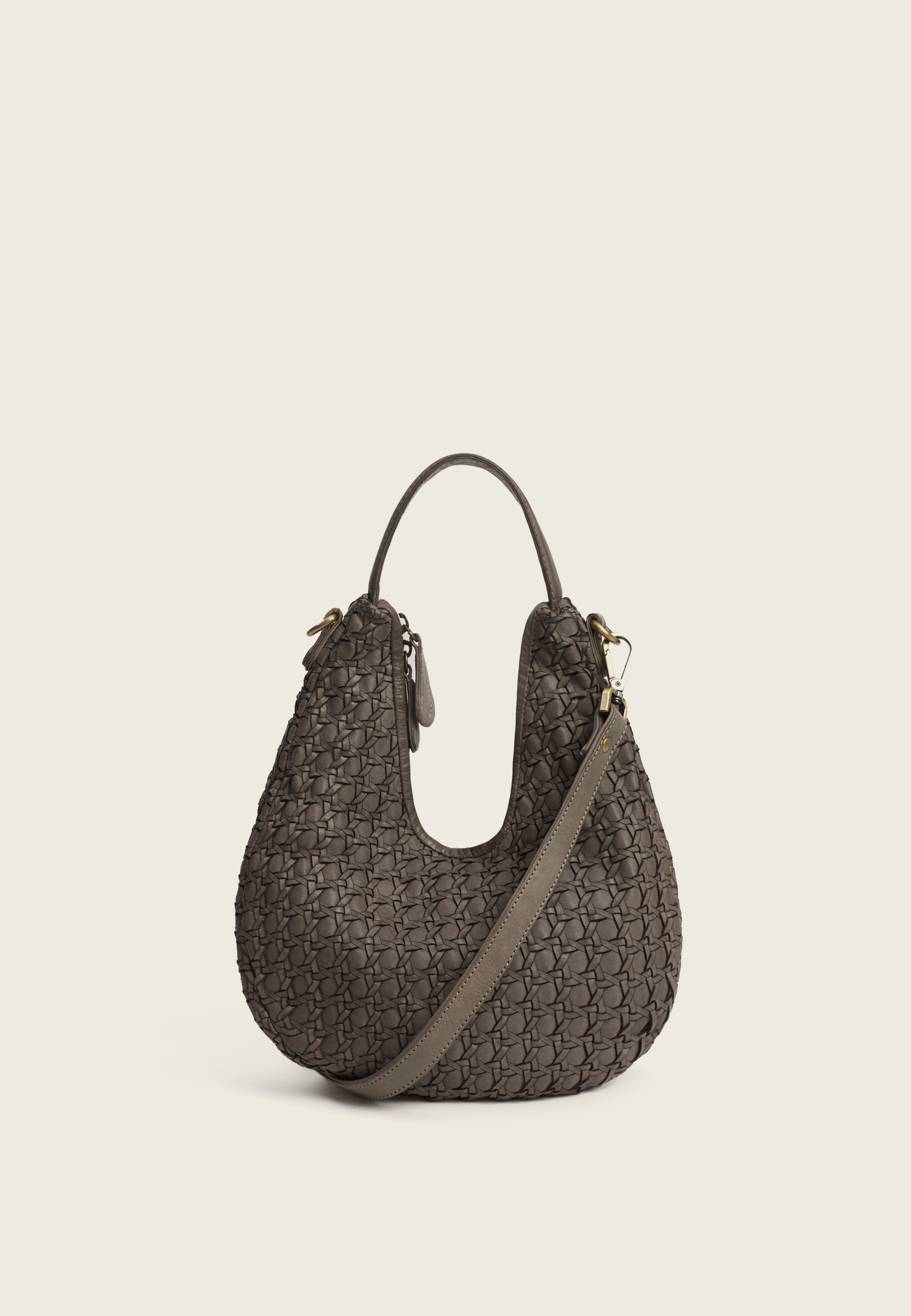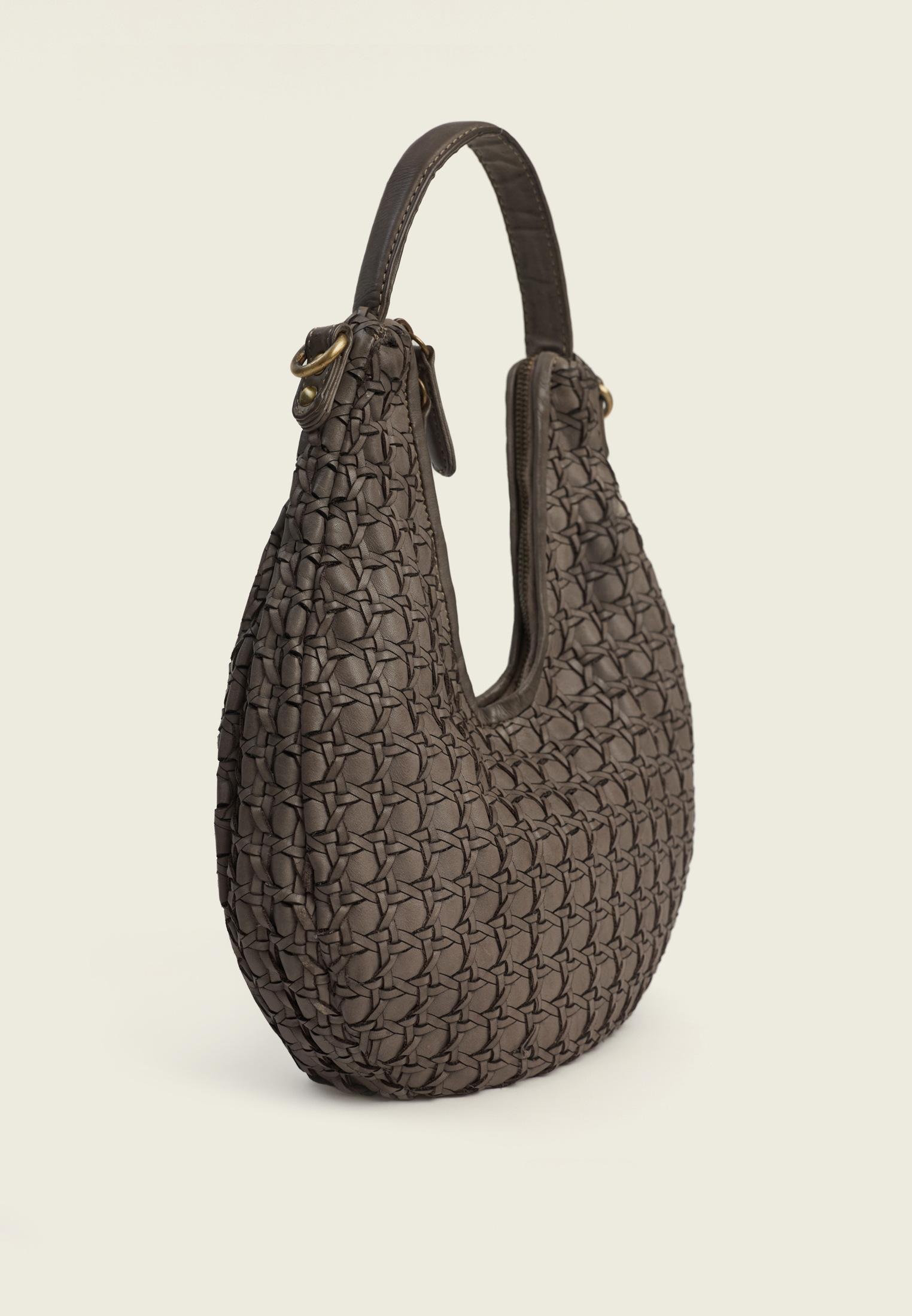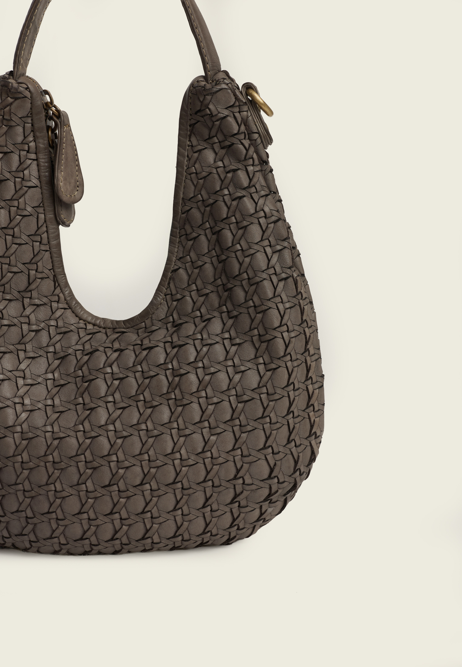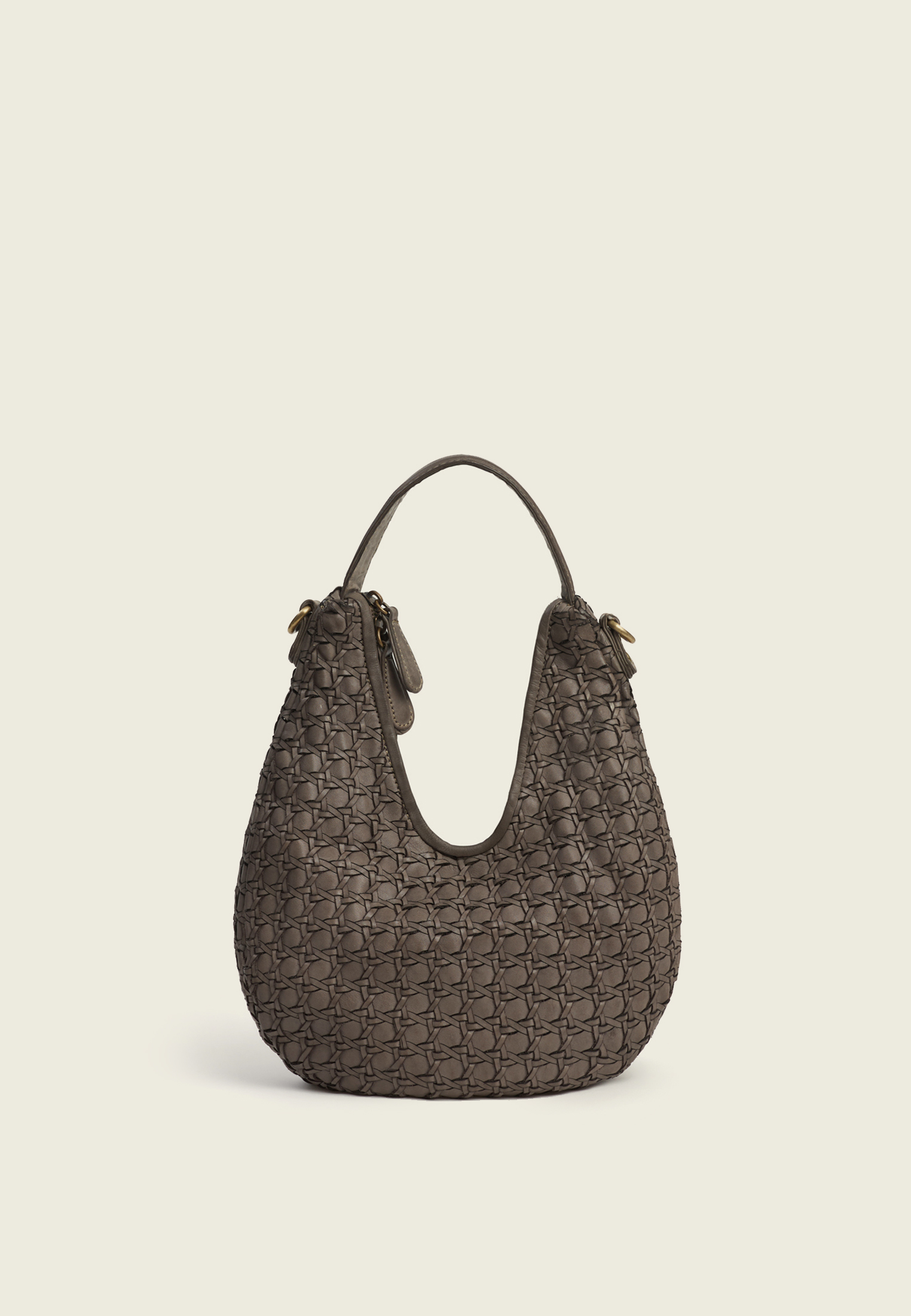 Сумка из фактурной плетёной кожи — выразительная модель с мягкой округлой формой. Она добавляет образу объём и тёплый акцент, при этом легко вписывается в повседневный гардероб.