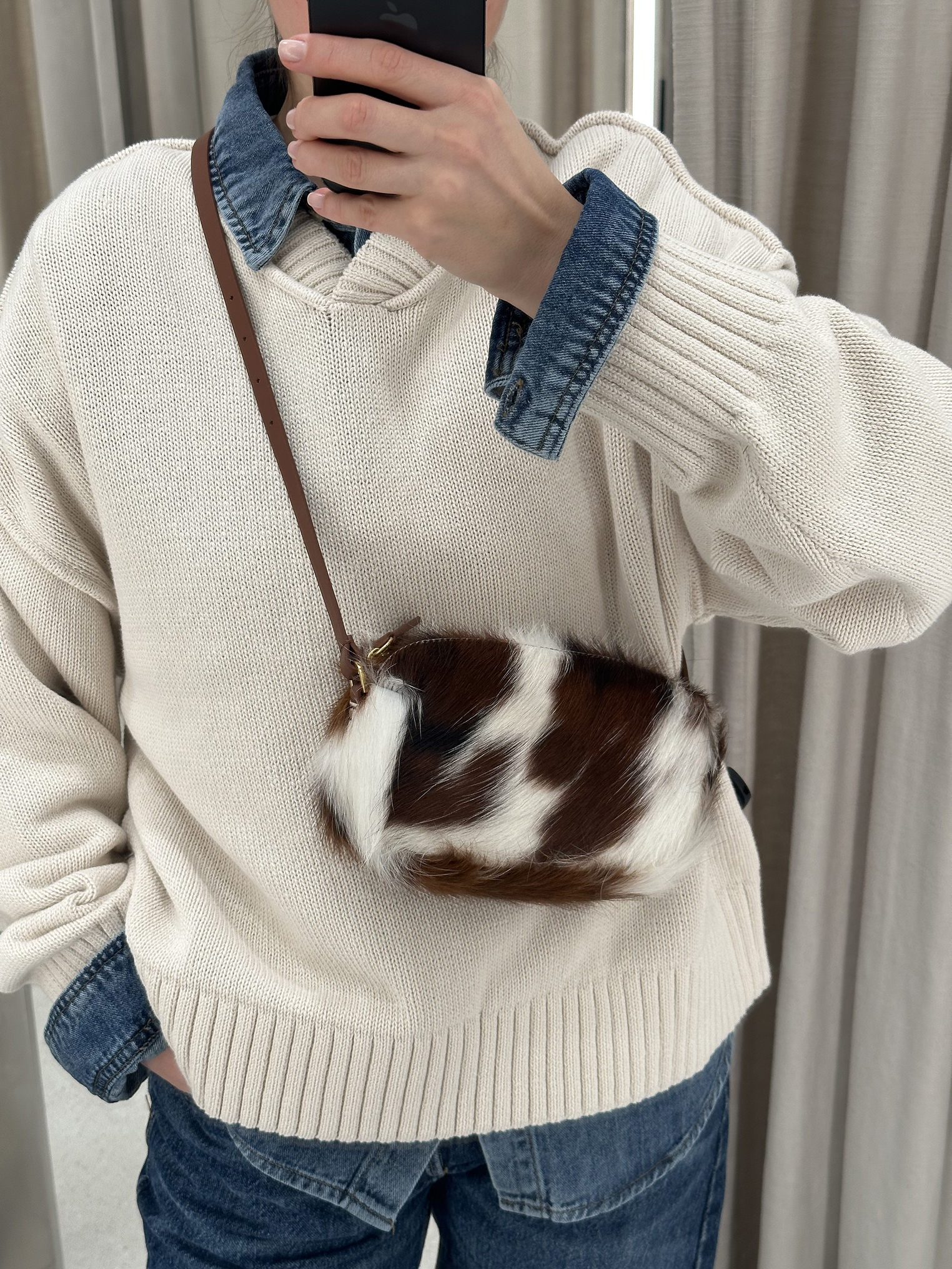 Мягкий плотный ворс ложится ровным, глубоким слоем, подчёркивая природный рисунок под корову — живой и выразительный. Сдержанные линии, аккуратные пропорции и продуманные детали делают её универсальной: она одинаково органично смотрится как в повседневных образах, так и в особых случаях, добавляя стильный акцент.