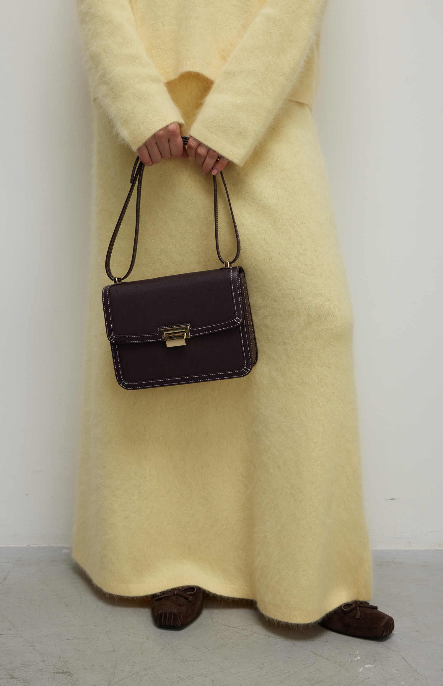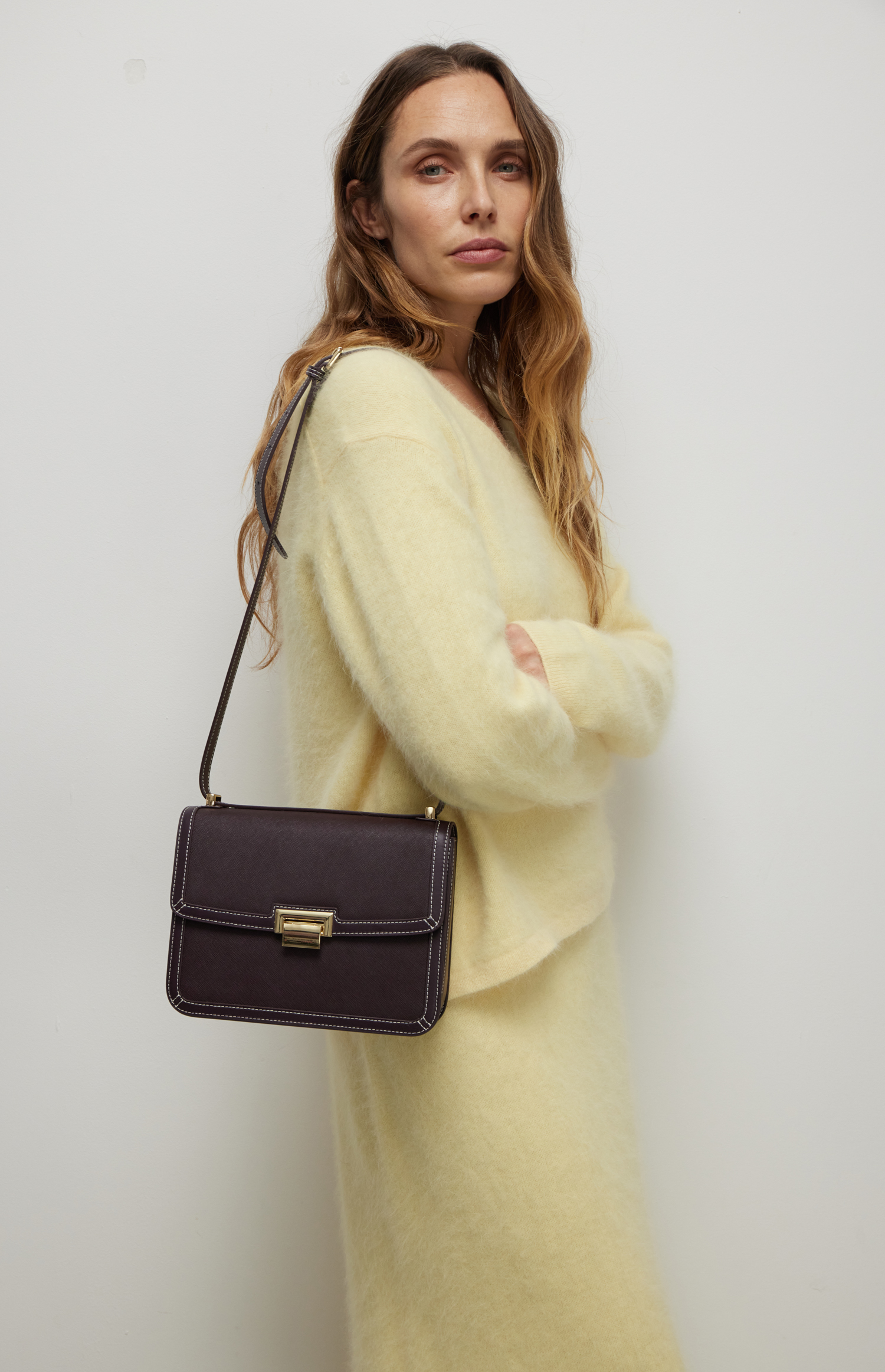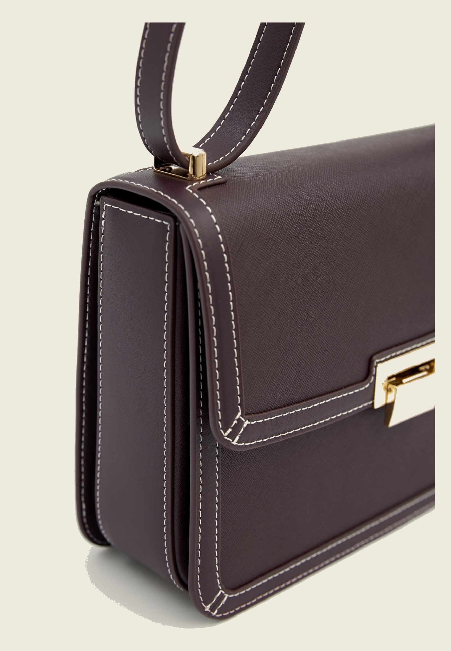 Сумка-конверт среднего размера на металлической застёжке с акцентными графичными швами. Сочетание гладкой и редкой сафьяновой кожи подчёркивает строгость и утончённость модели.