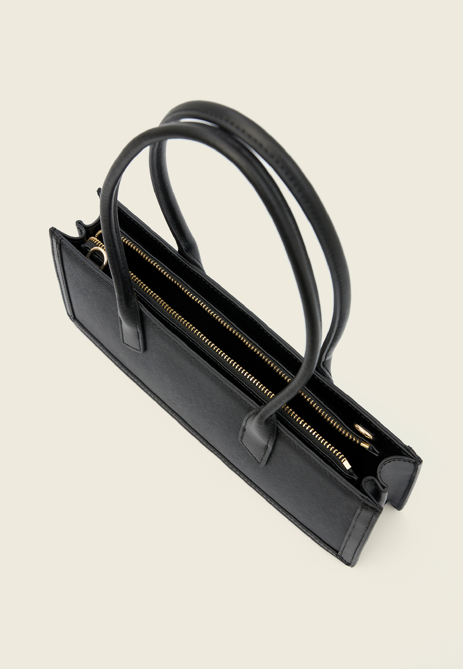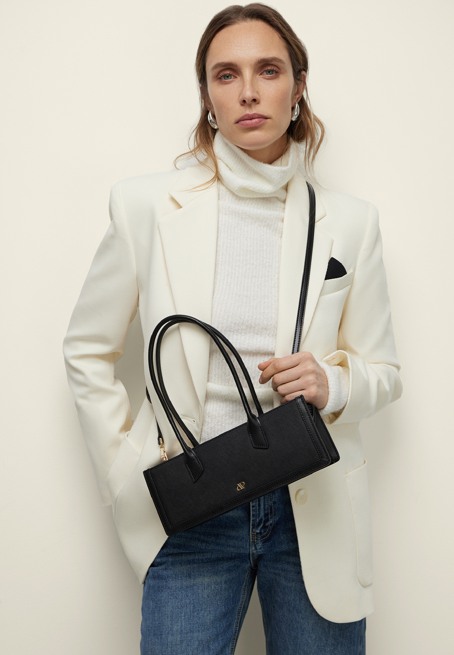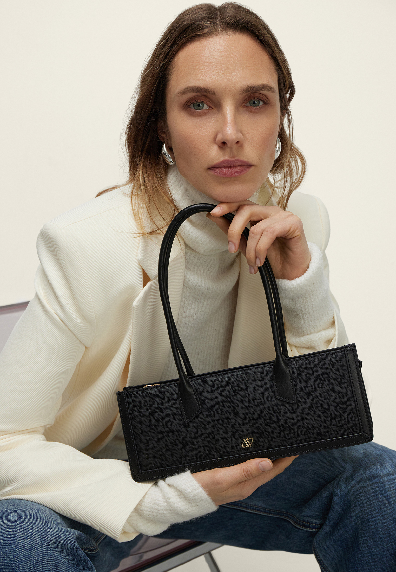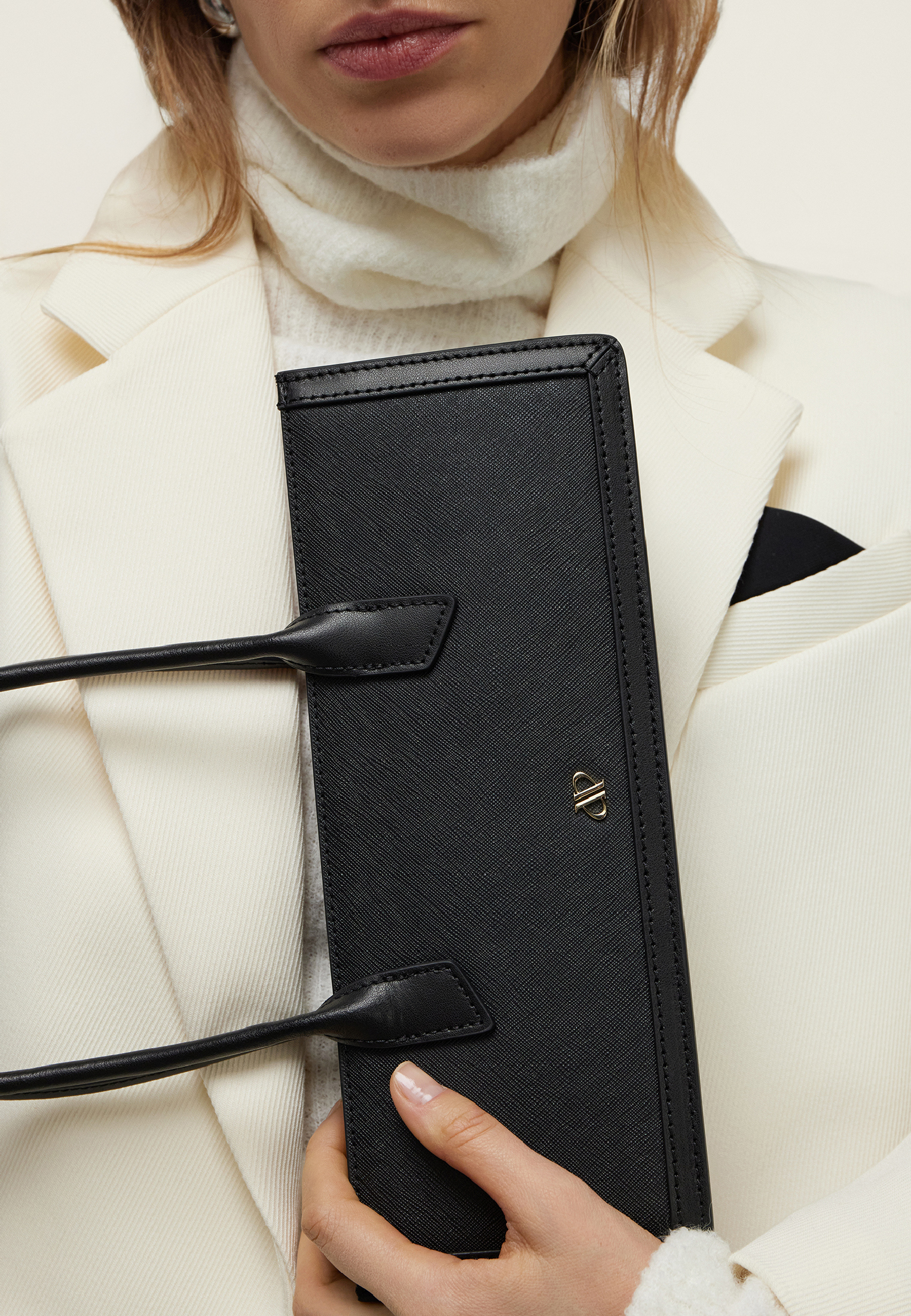 Компактная и элегантная — эта вытянутая форма давно стала классикой и актуальна как никогда. Удобный формат позволяет взять с собой всё необходимое: длинный кошелёк, смартфон и другие мелочи. Глубокий чёрный цвет и лаконичный дизайн подчёркивают универсальность модели.