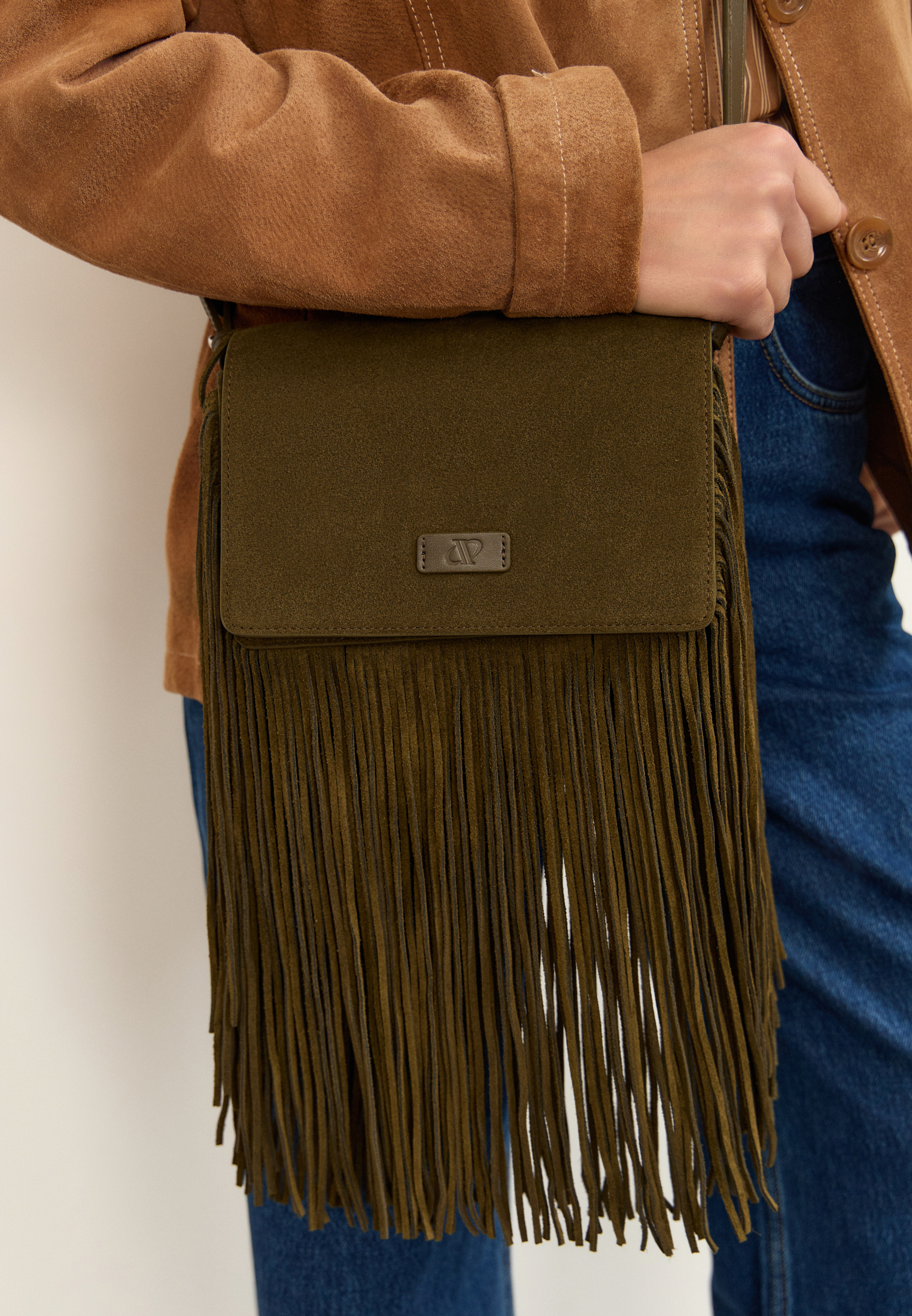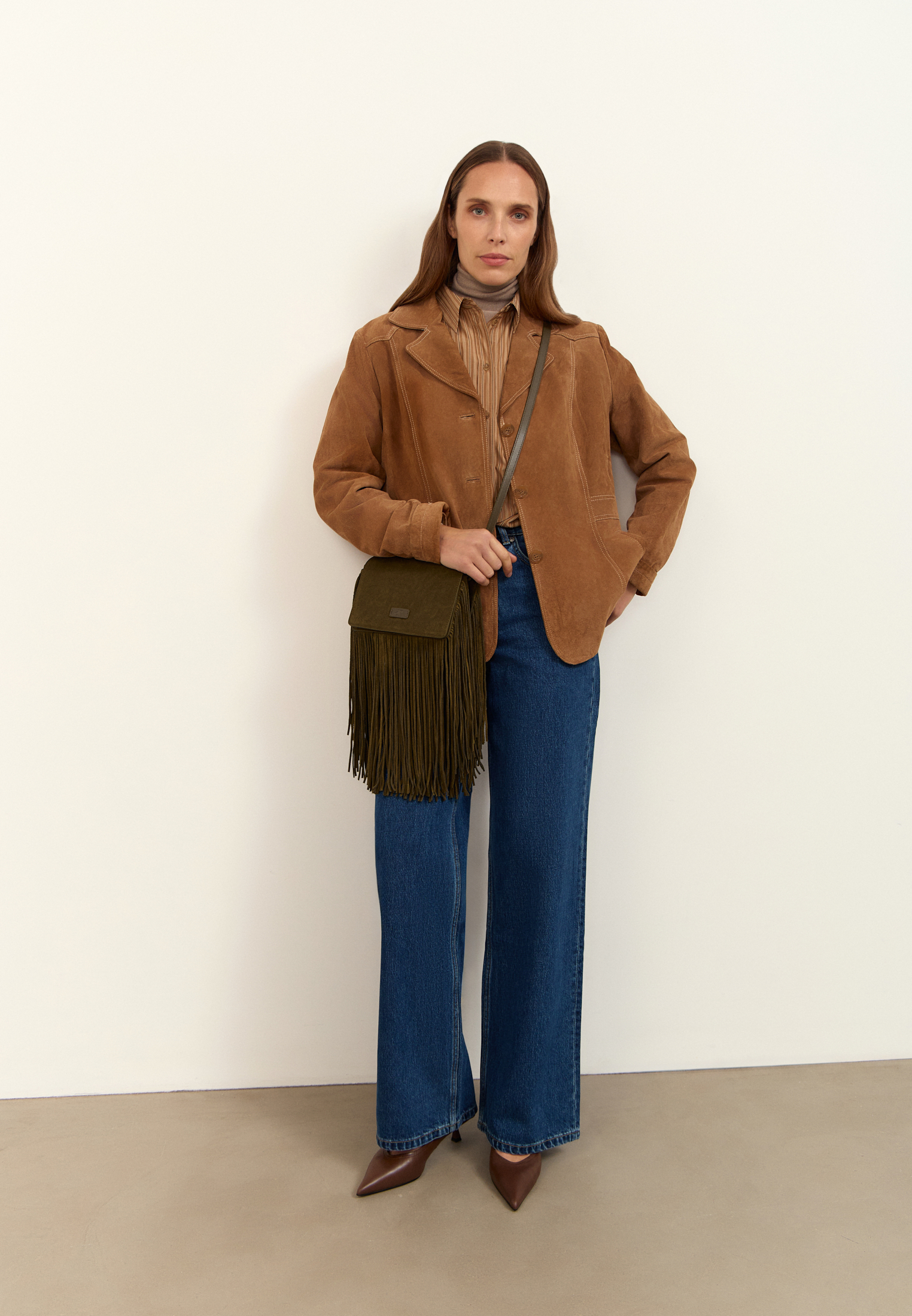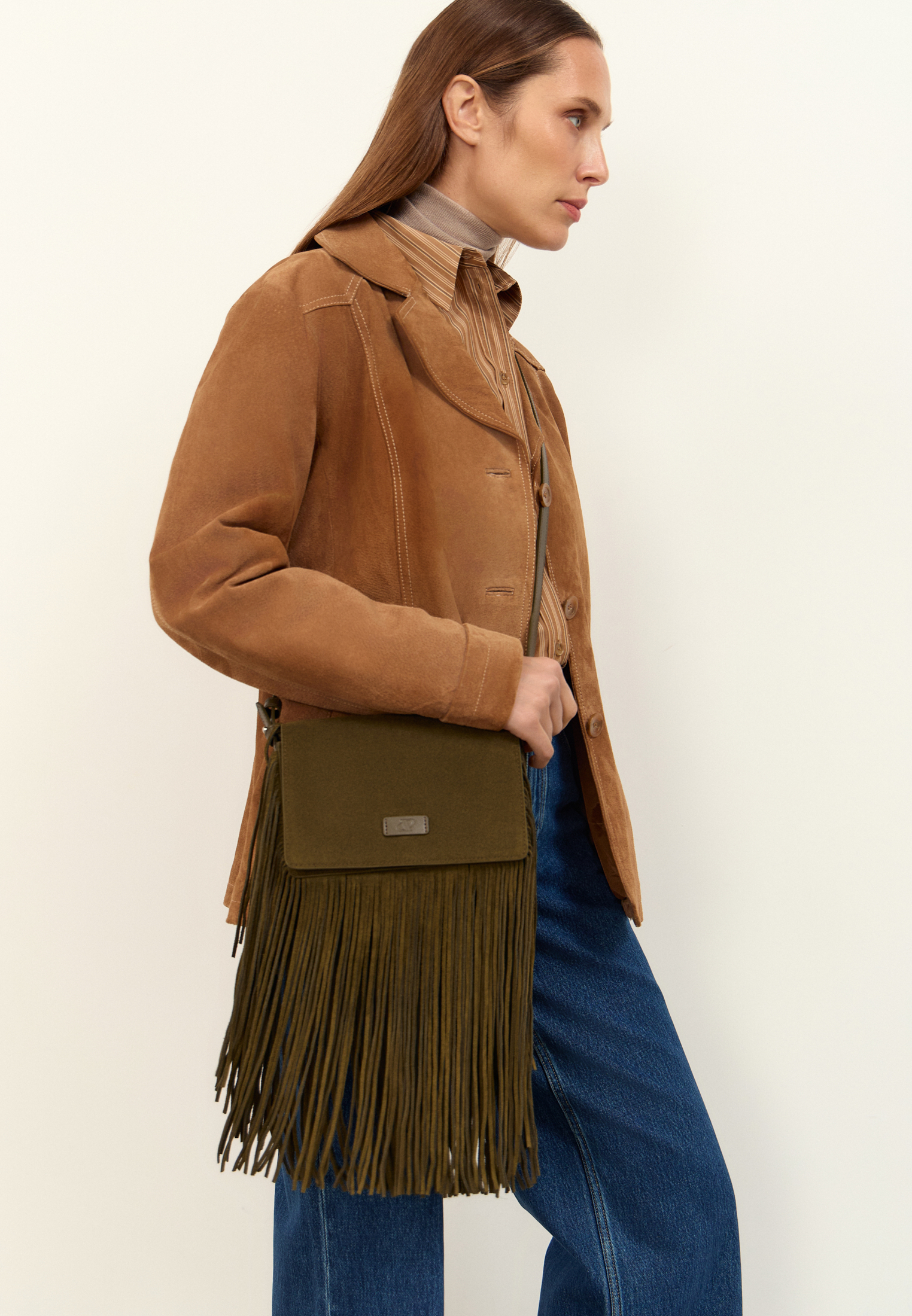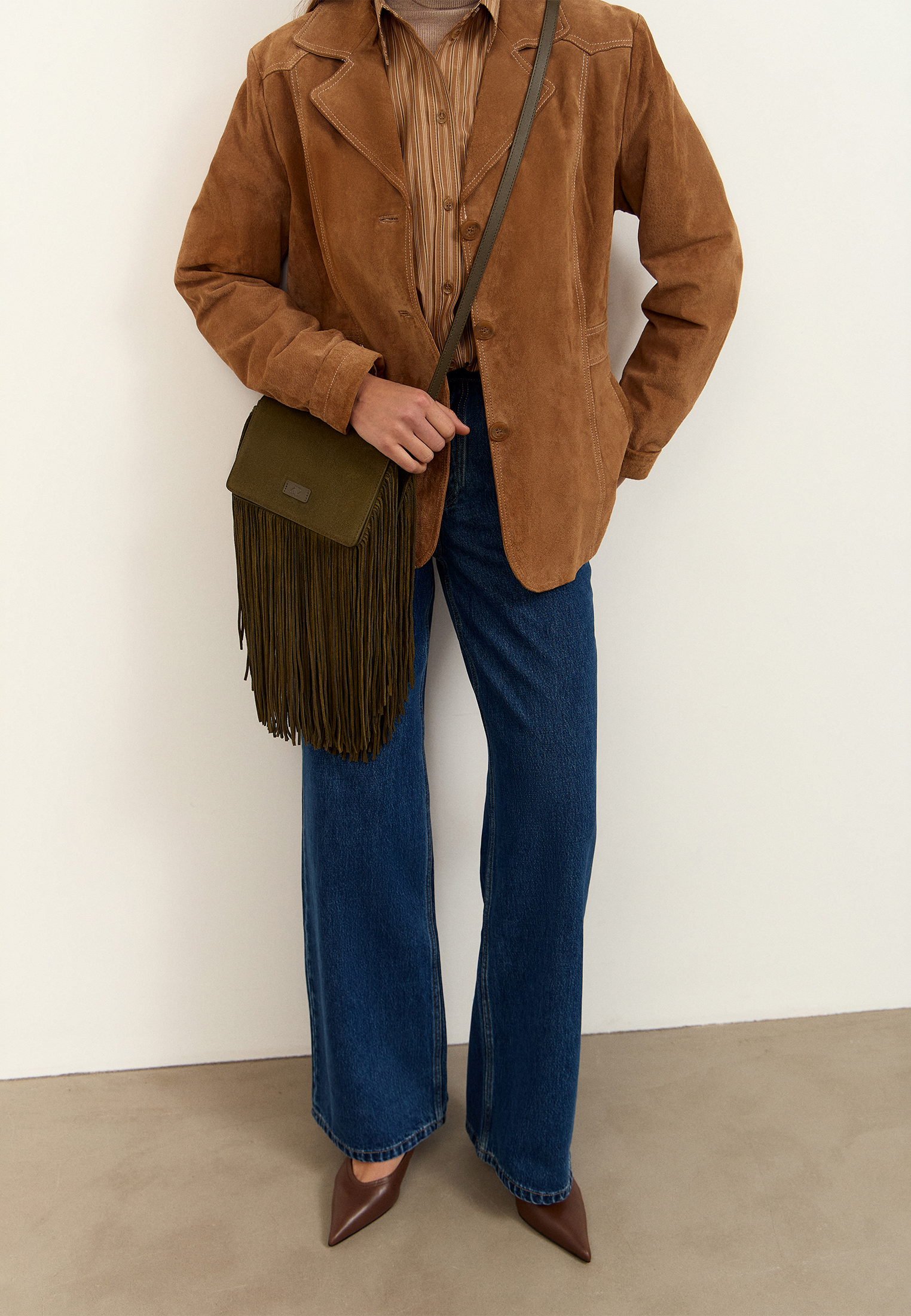 Выполненная из мягкой замши в глубоком природном оттенке, модель украшена длинной, подвижной бахромой. Этот выразительный элемент добавляет динамики образу и подчёркивает непринуждённость стиля. Идеальный вариант для тех, кто ценит индивидуальность, комфорт и лёгкий налёт ностальгии.