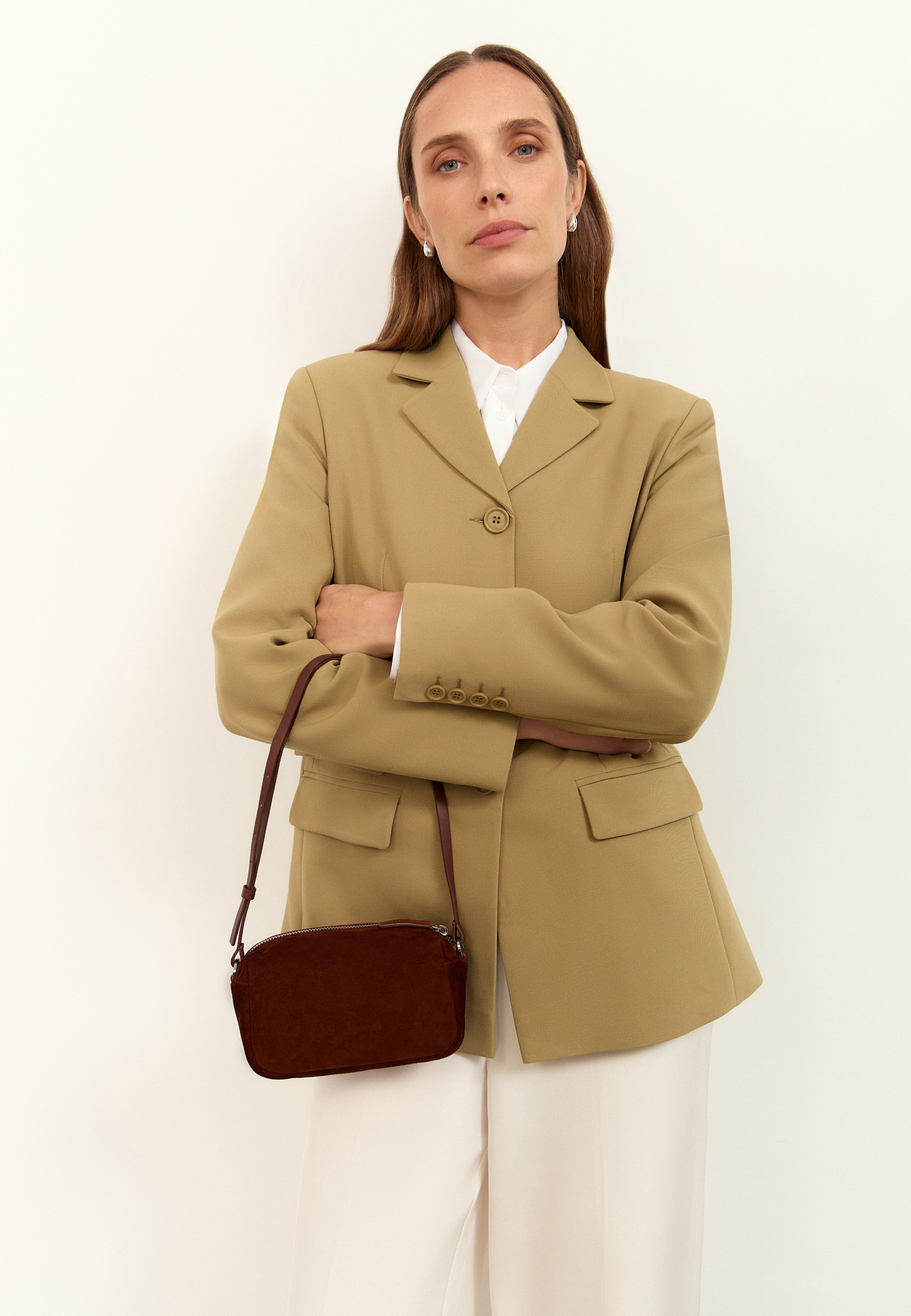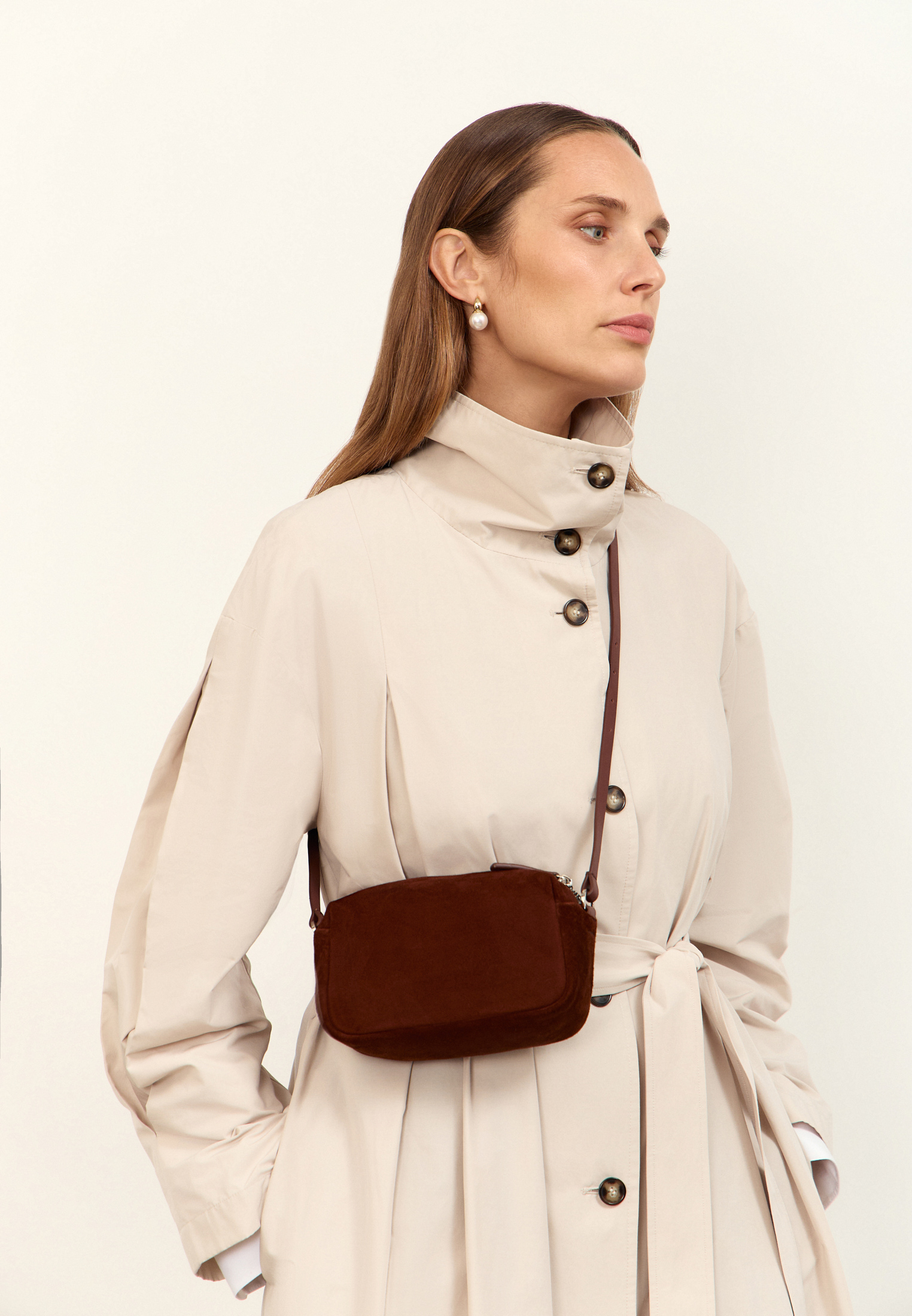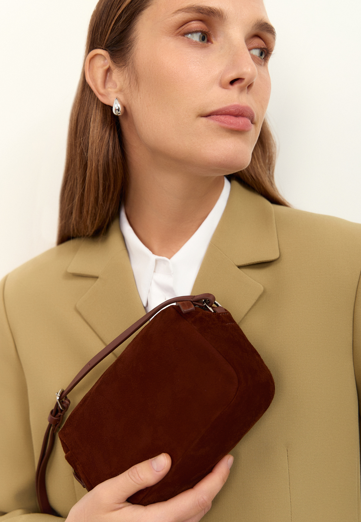 Компактная форма и регулируемый ремень позволяют носить сумку как на плече, так и в руках. Материал подчёркивает глубину цвета и придаёт аксессуару выразительность.