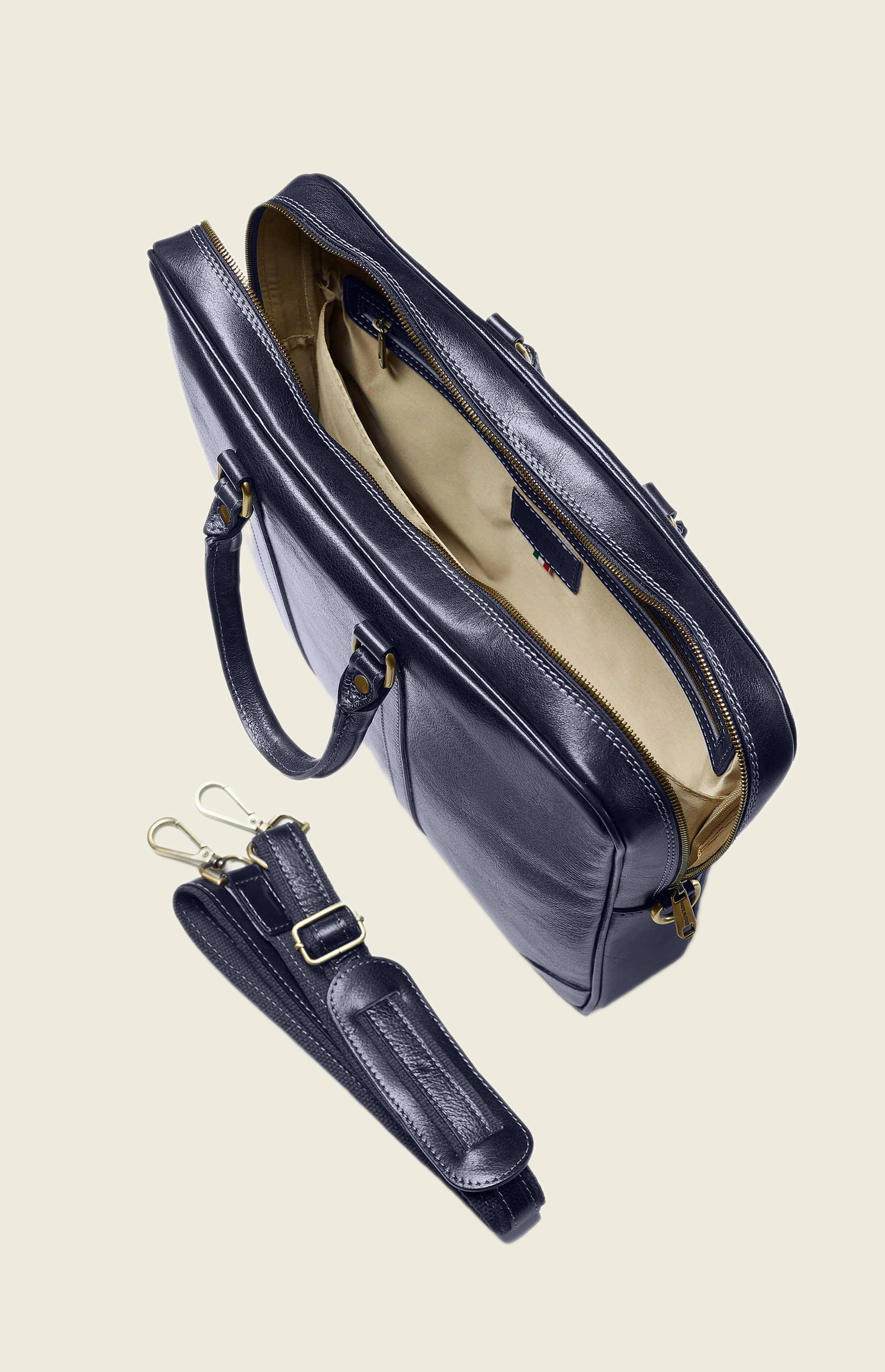 Внутри — два отделения, разделённые перегородкой, поэтому в нём так удобно носить все рабочие атрибуты: ноутбук, документы, зарядки, ручки и блокноты. Их дополняет карман на молнии, чтобы спрятать ключи, карточки и документы.