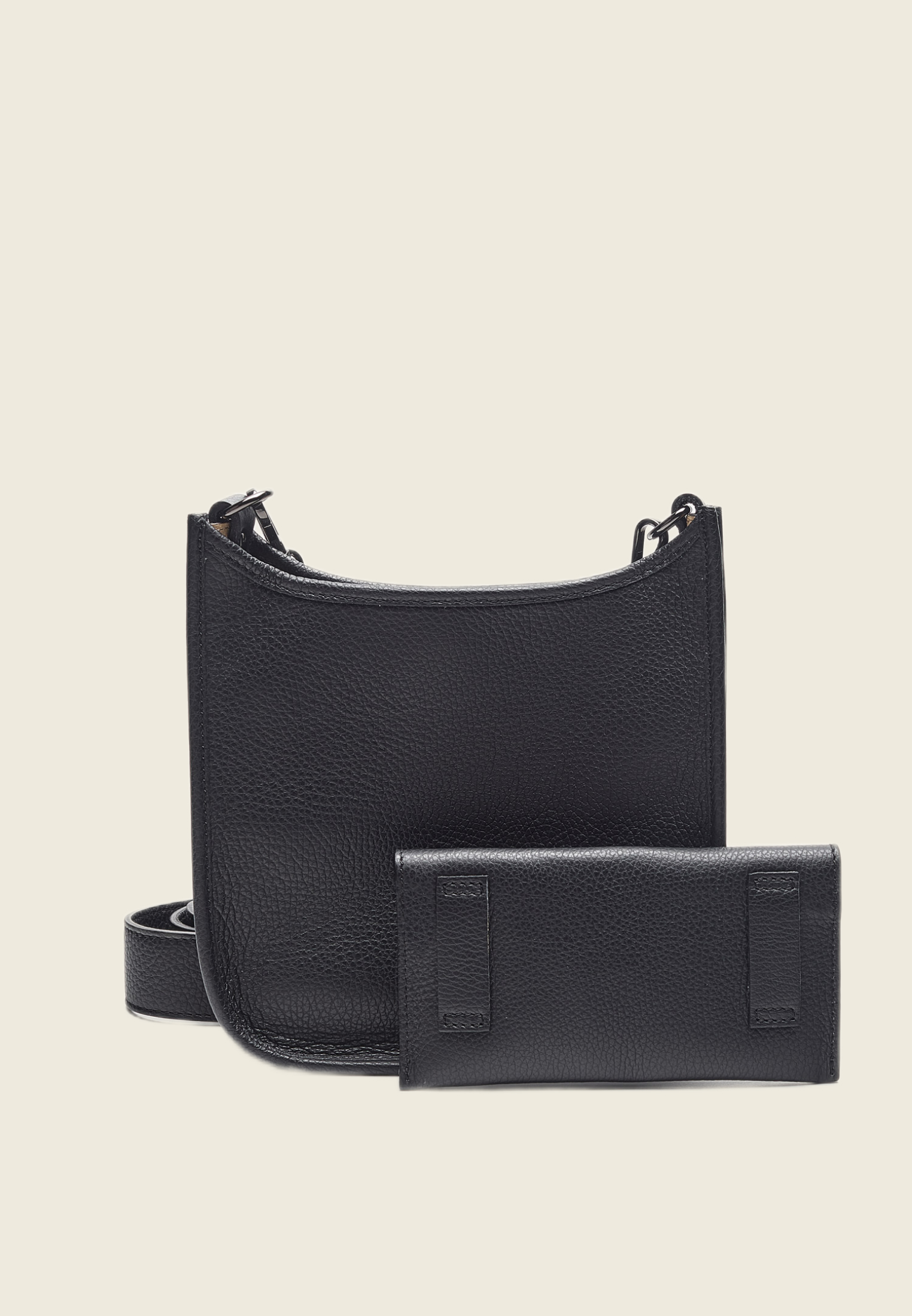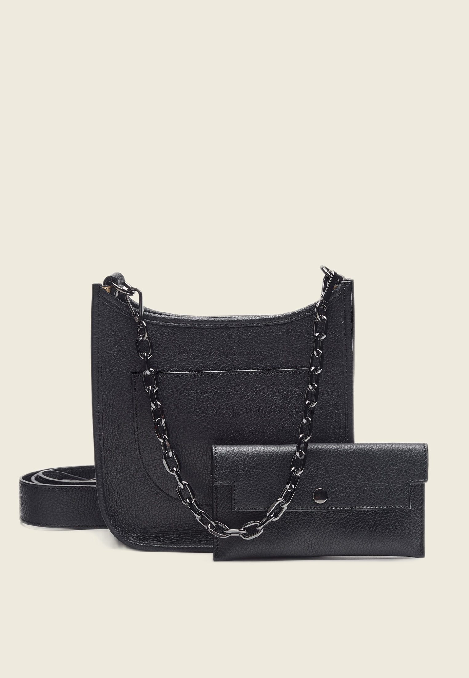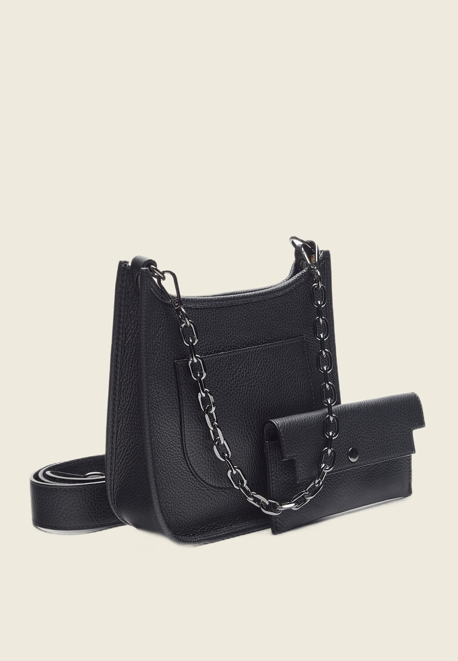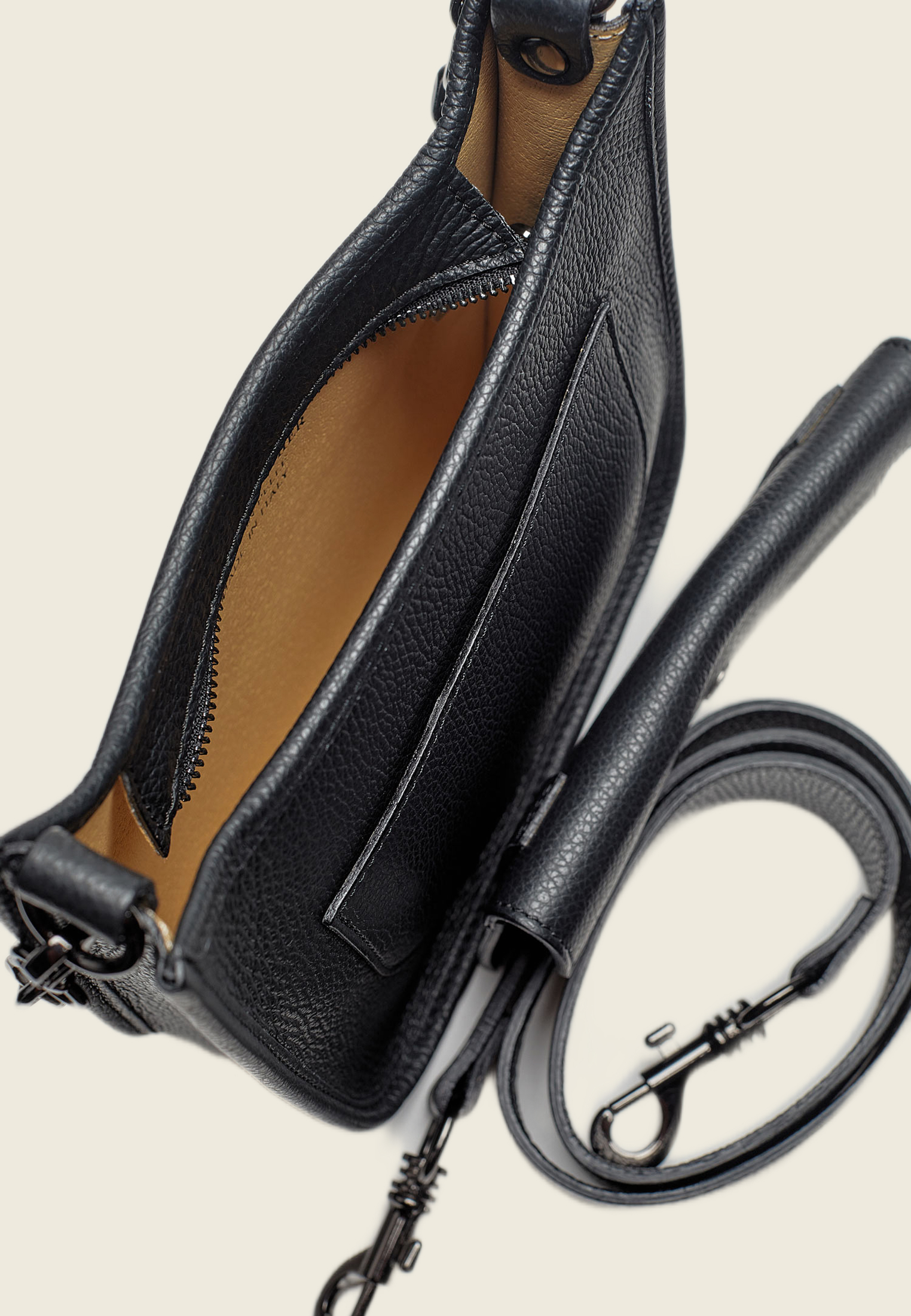 Сумка выполнена из мягкой зернистой кожи, закрывается на молнию, есть внешний карман. Внутри — одно отделение и кошелёк в комплекте. Два съёмных ремешка: кожаный для более сдержанного образа и цепочка — когда хочется добавить акцента.