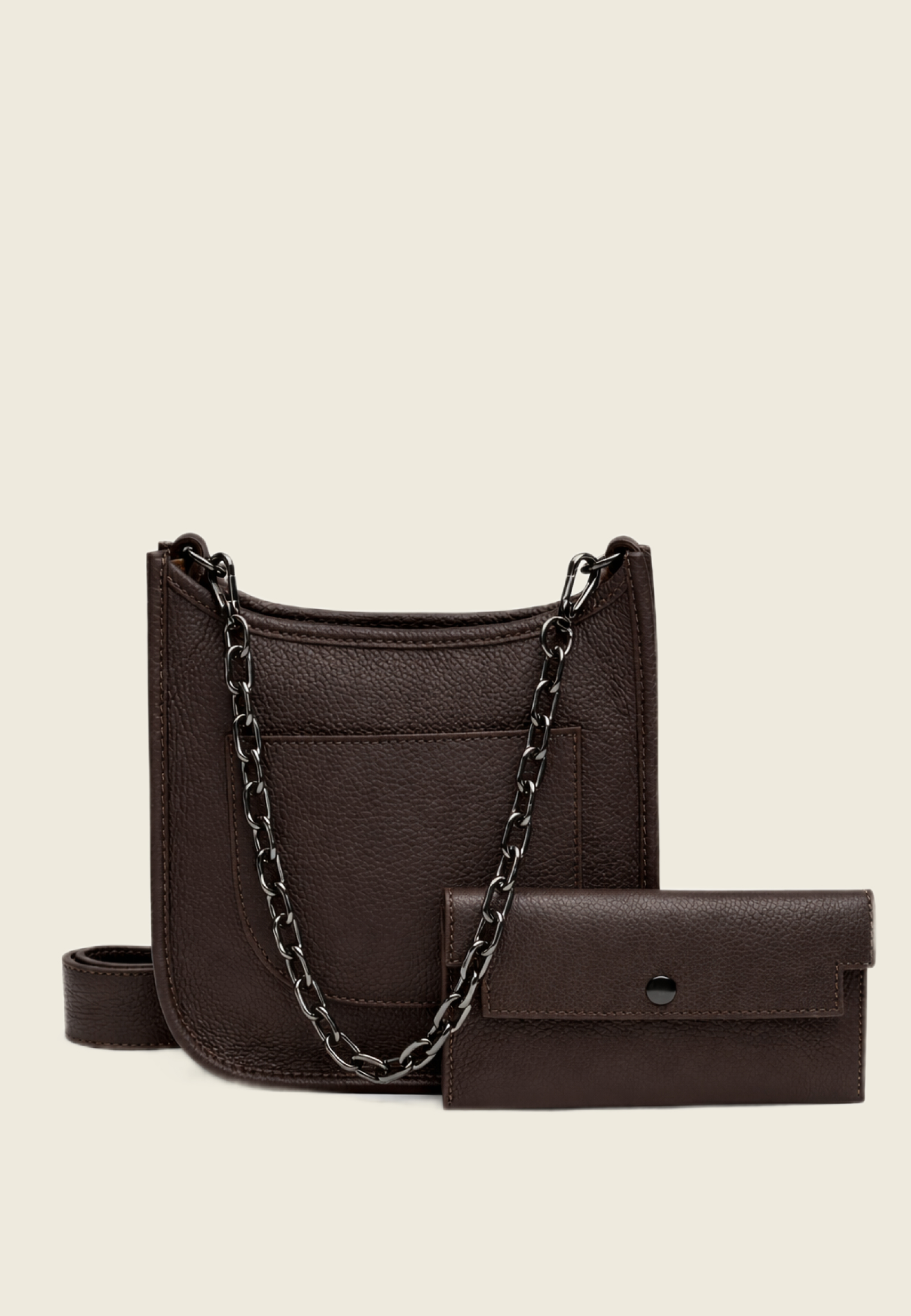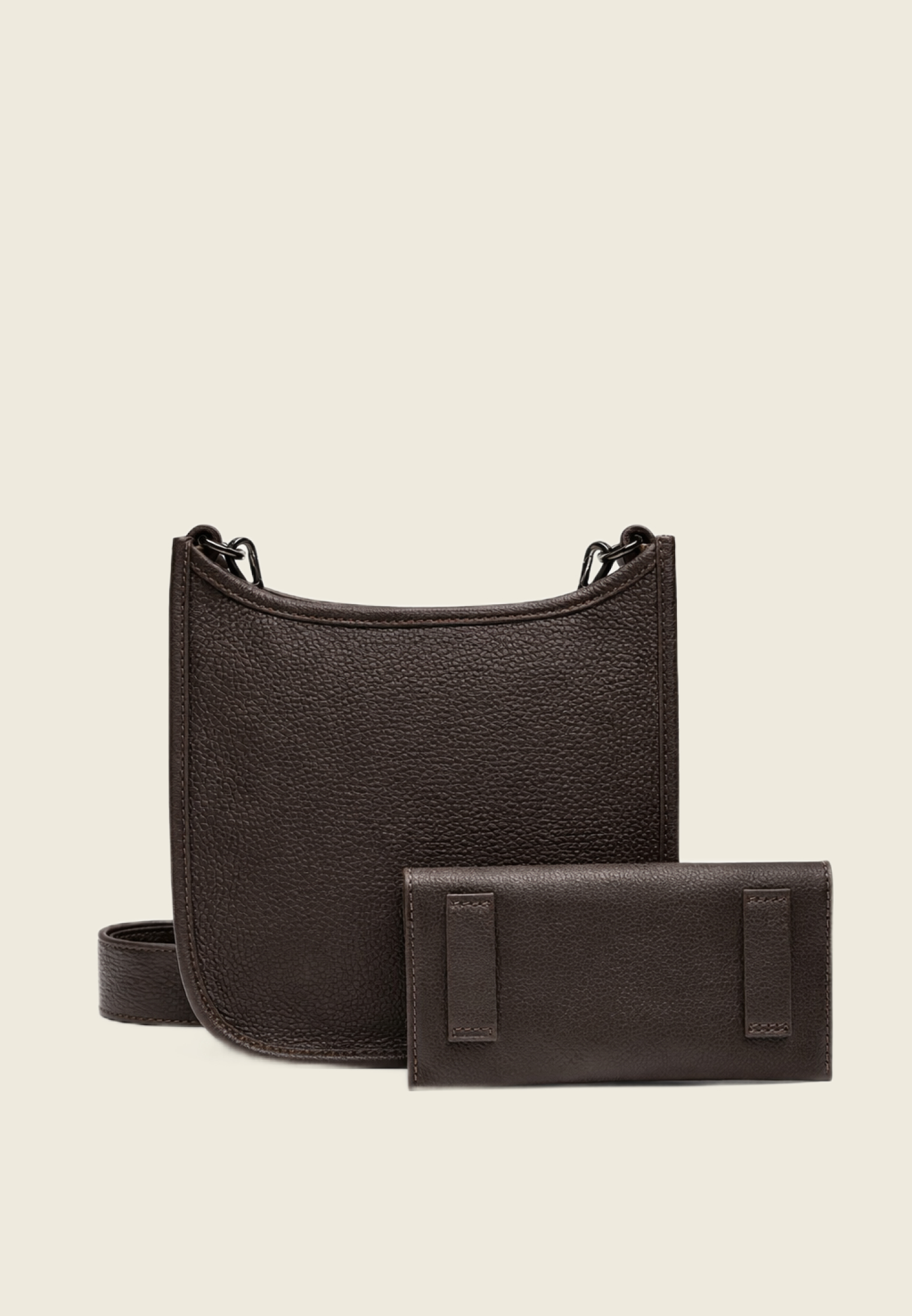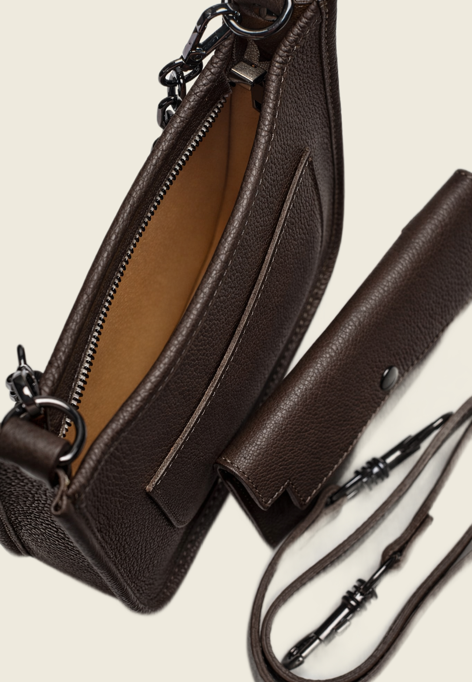 Сумка выполнена из мягкой зернистой кожи, закрывается на молнию, есть внешний карман. Внутри — одно отделение и кошелёк в комплекте. Два съёмных ремешка: кожаный для более сдержанного образа и цепочка — когда хочется добавить акцента.