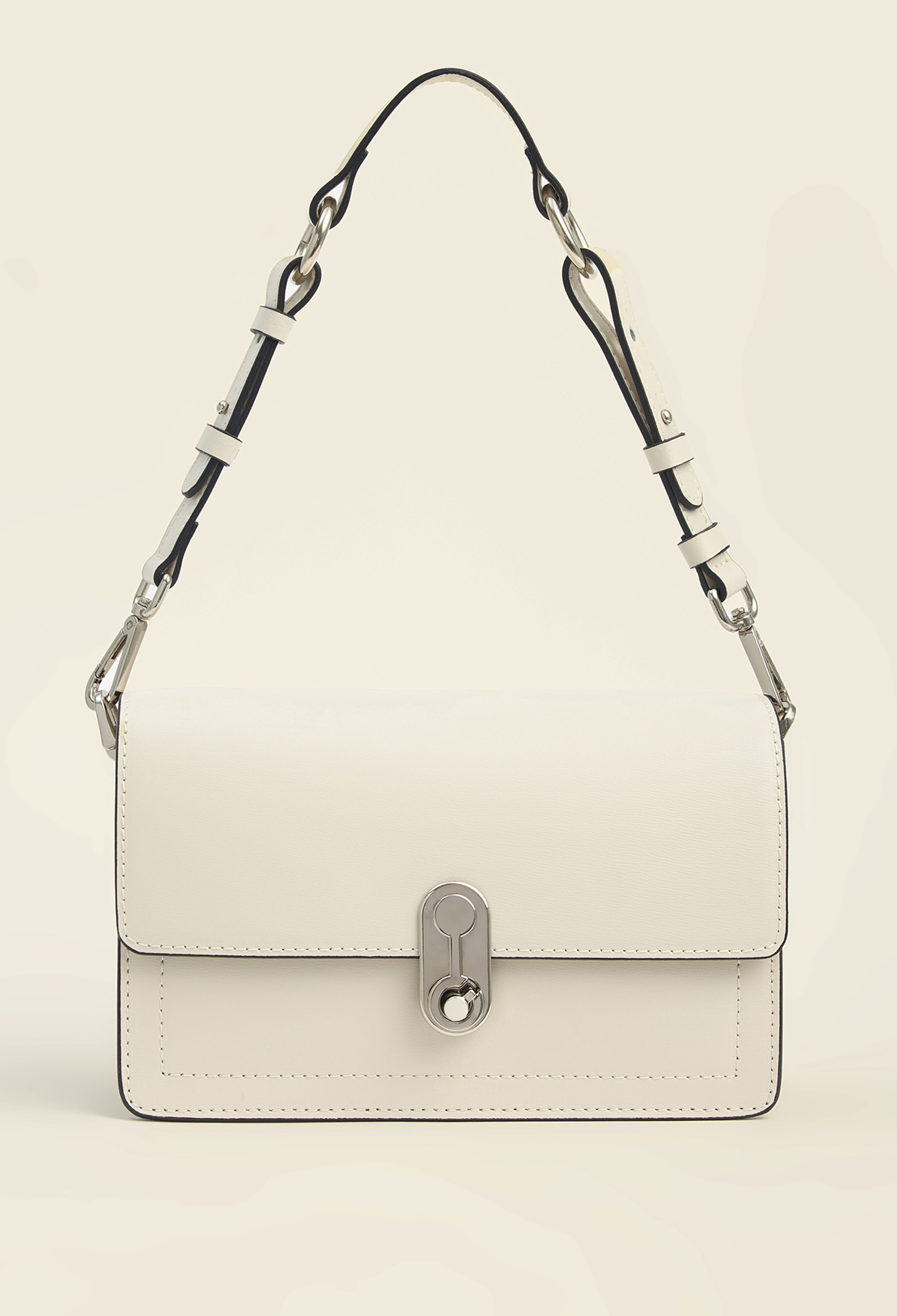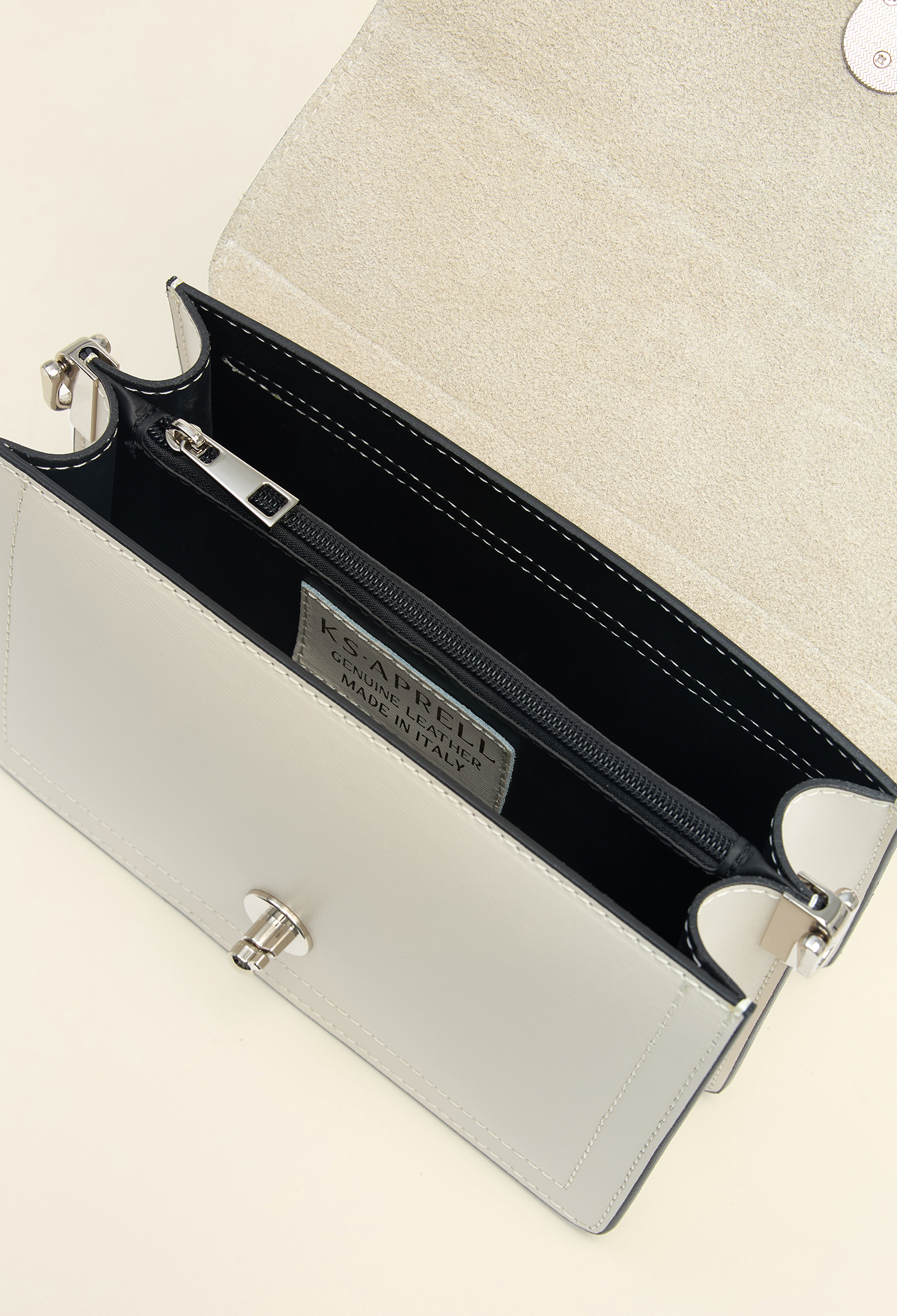 Внутри — два отделения и перегородка на молнии для порядка и удобства. Съёмный регулируемый ремень позволяет носить сумку как вам удобно — в руке,на плече или как кросс-боди.