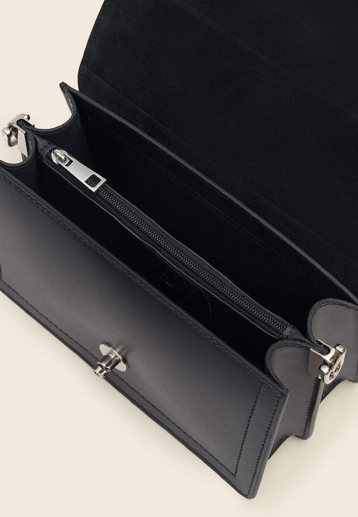 Внутри — два отделения и перегородка на молнии для порядка и удобства. Съёмный регулируемый ремень позволяет носить сумку как вам удобно — в руке,на плече или как кросс-боди.