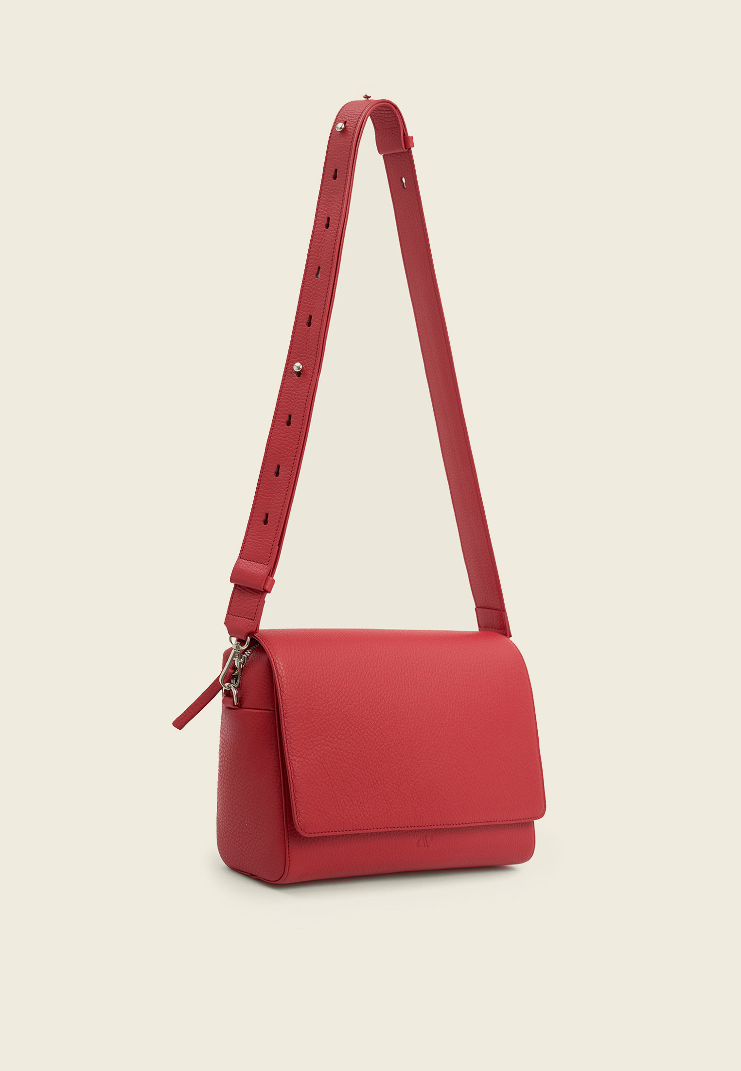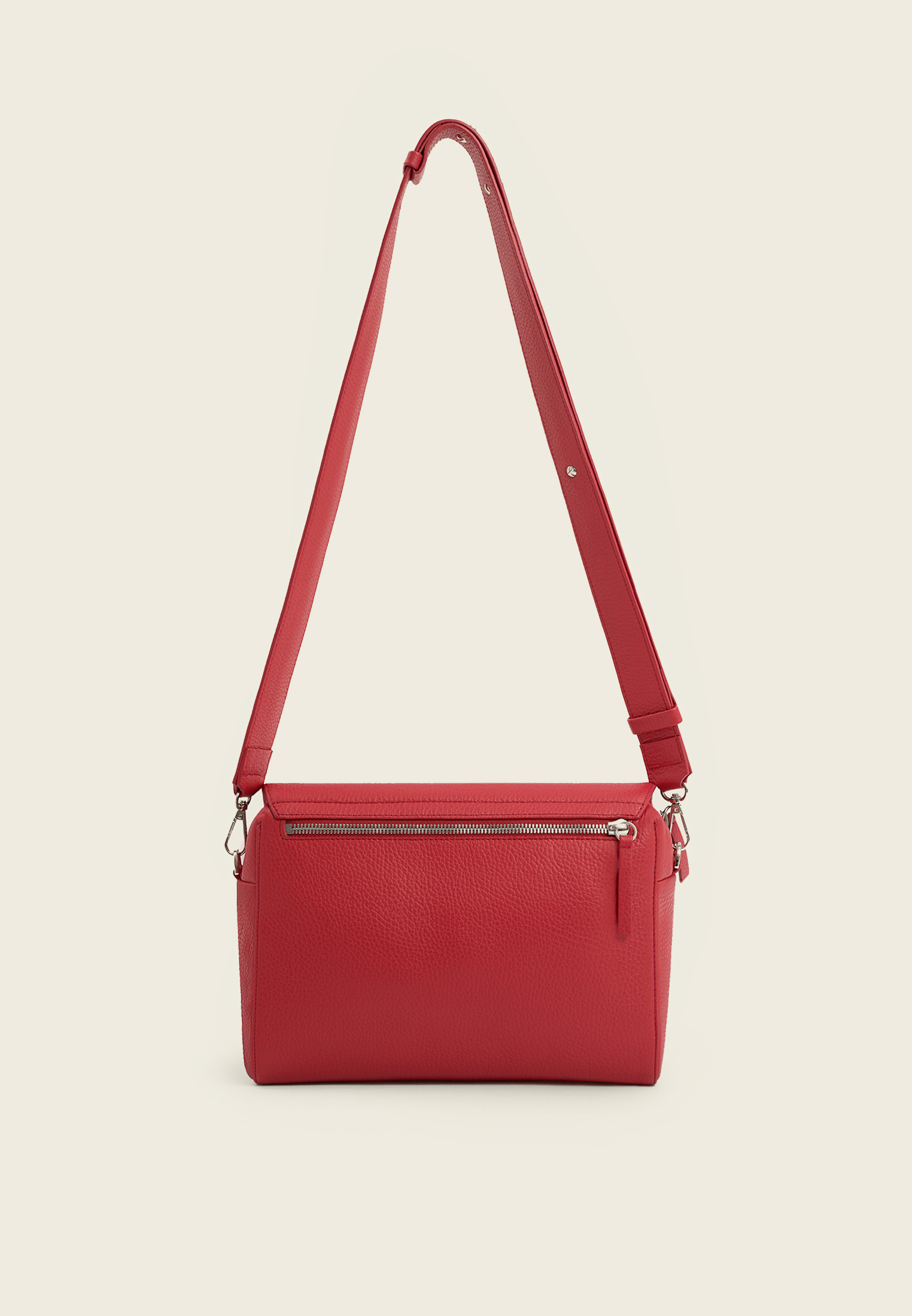 Сумка закрывается на молнию и магнитную кнопку. Внутри — просторное отделение и два открытых кармана для мелочей. Снаружи, на задней стенке, расположен карман на молнии. В комплект входит съёмный регулируемый ремень.