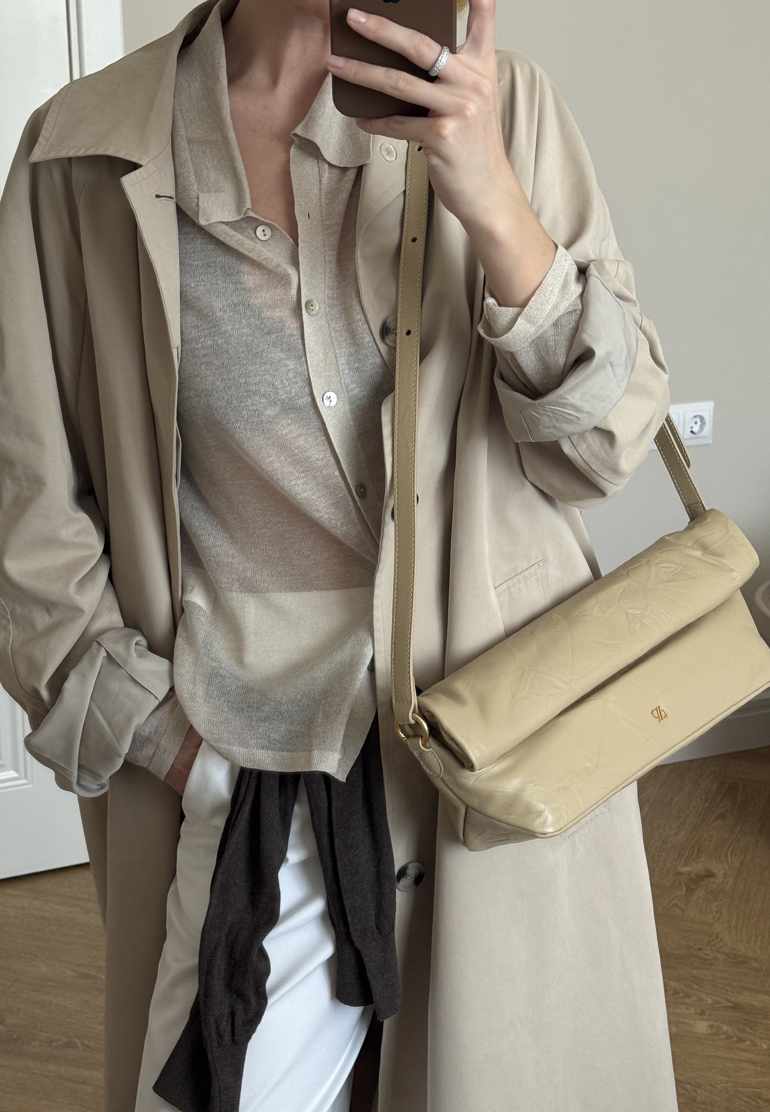 Сумка-клатч из мягкой гладкой кожи с лёгкой текстурной неровностью станет вашим универсальным спутником на каждый день. Съёмный ремень на кольцах-карабинах позволяет носить её через плечо, оставляя руки свободными для города, или убрать ремень и превратить в элегантный вечерний аксессуар.
