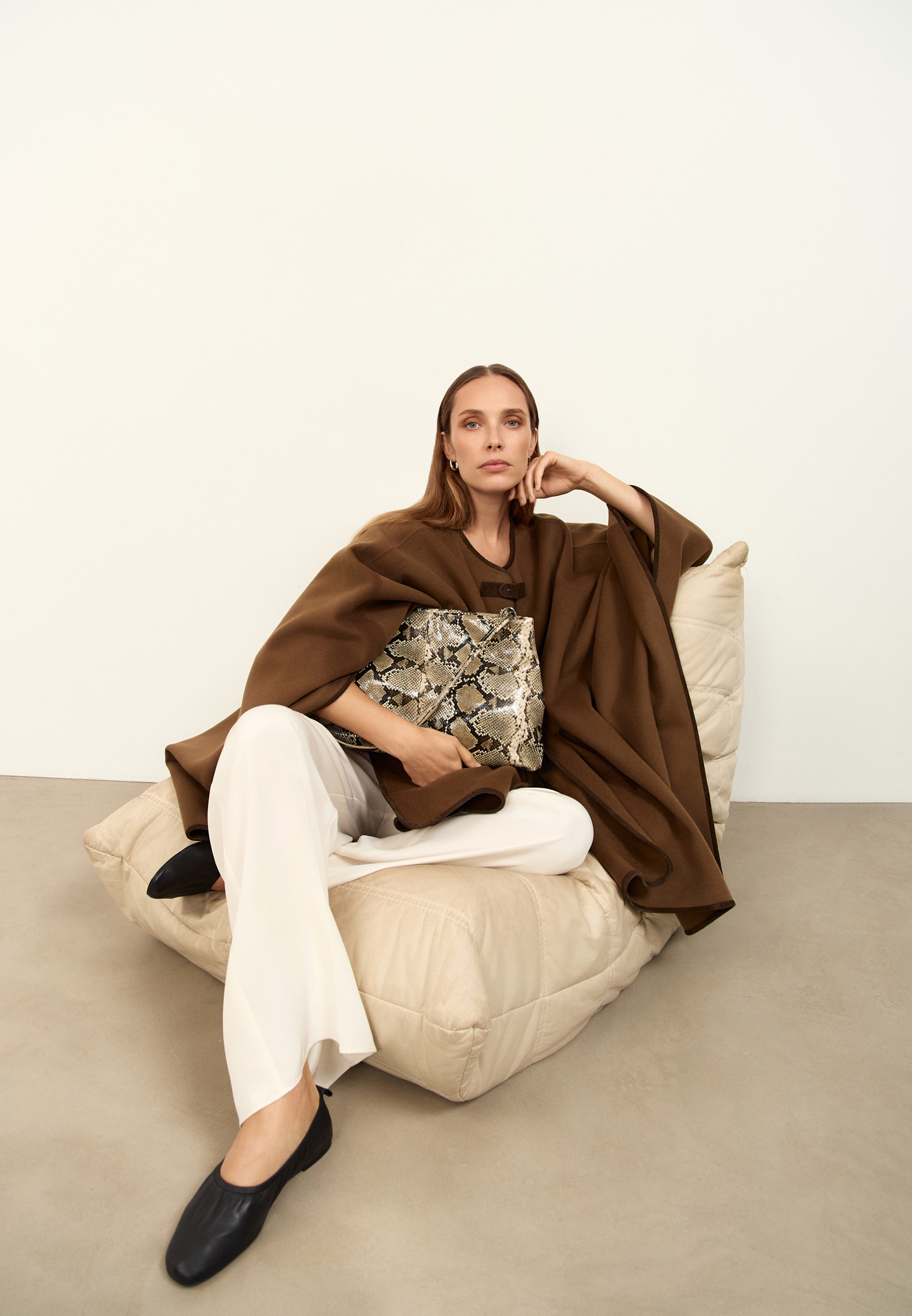 Кожа обладает лёгким глянцевым эффектом, который подчёркивает её изящество. Эта модель легко впишется в деловой, повседневный и вечерний образы. Благодаря мягкой конструкции сумку можно носить как клатч.