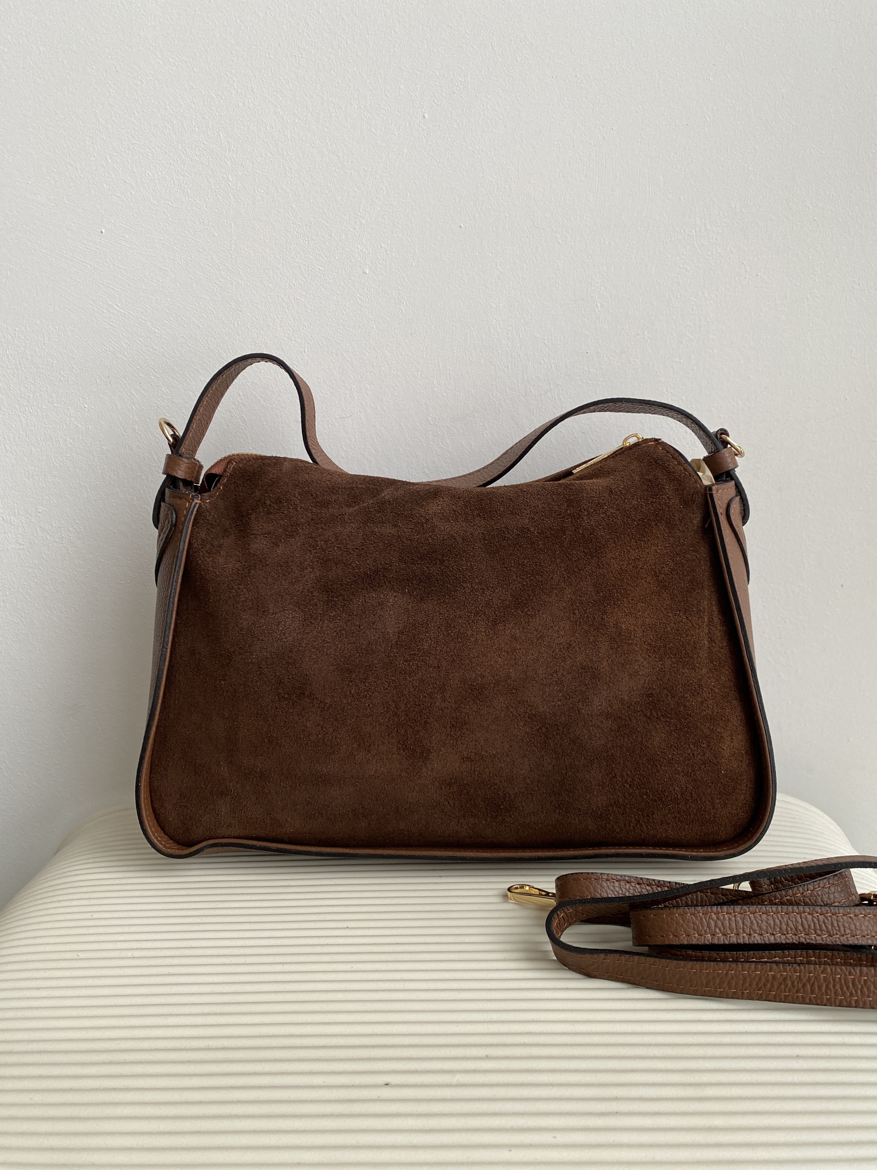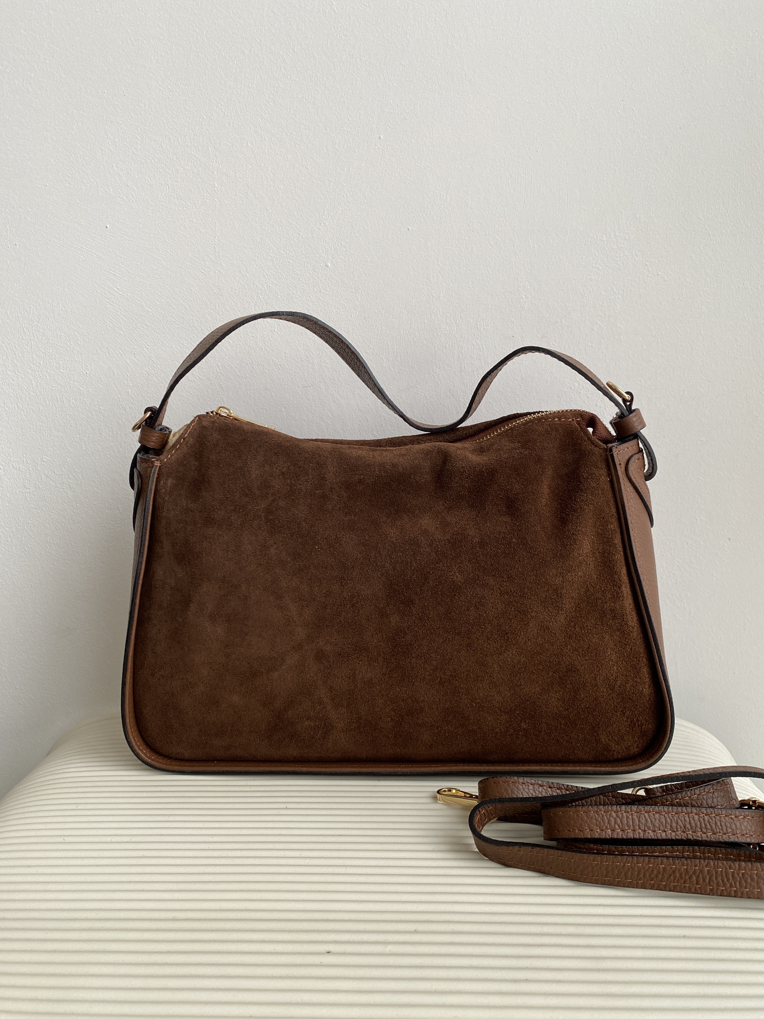 Замша: перед первым выходом обработайте влагозащитным спреем. Чистите щёткой для замши, при сильных загрязнениях используйте специализированные средства. При необходимости можно применять кондиционер или освежающий спрей для восстановления цвета и мягкости.